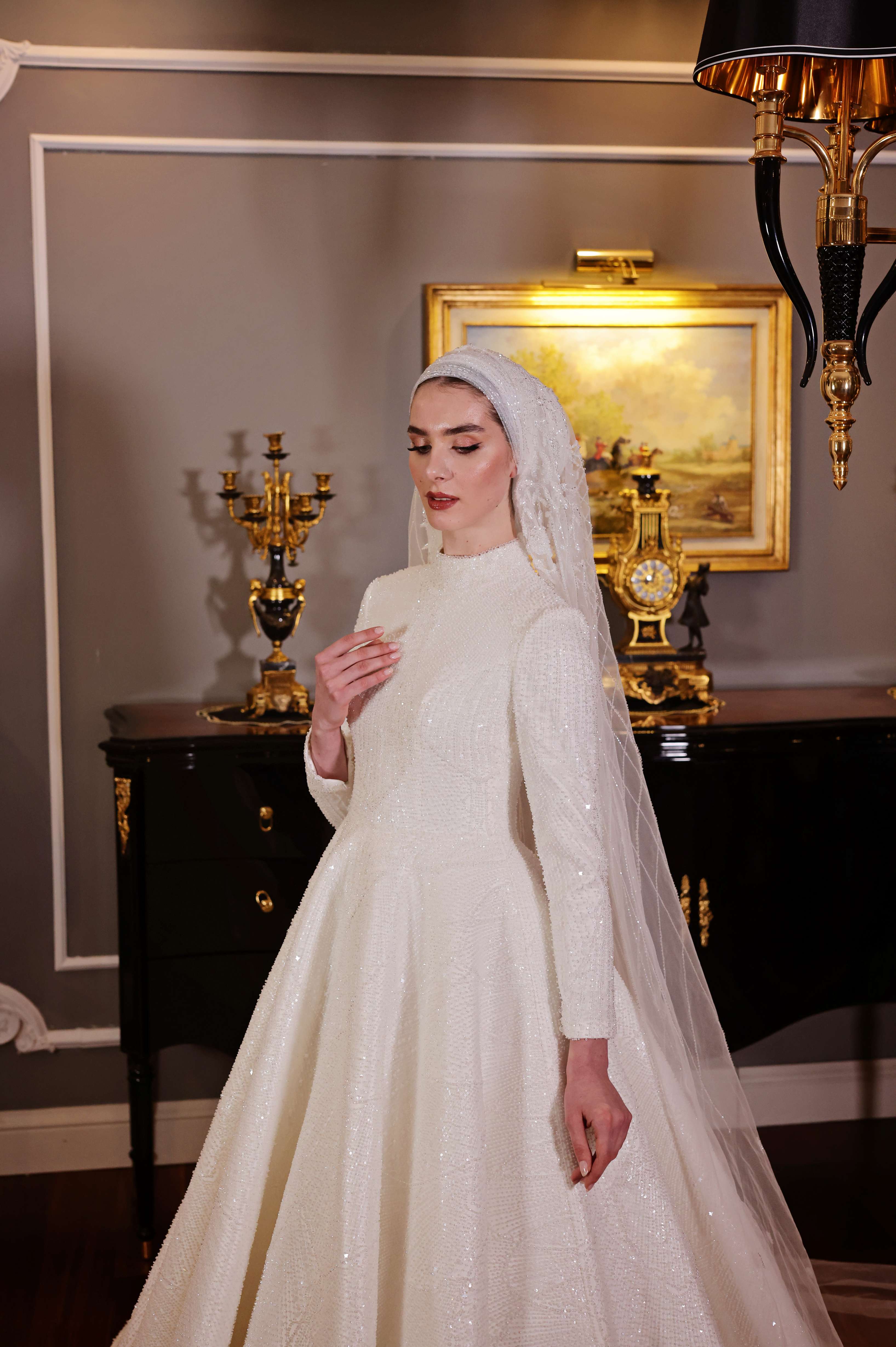 - A-line wedding dress with a high neckline, long sleeves, and fitted waist