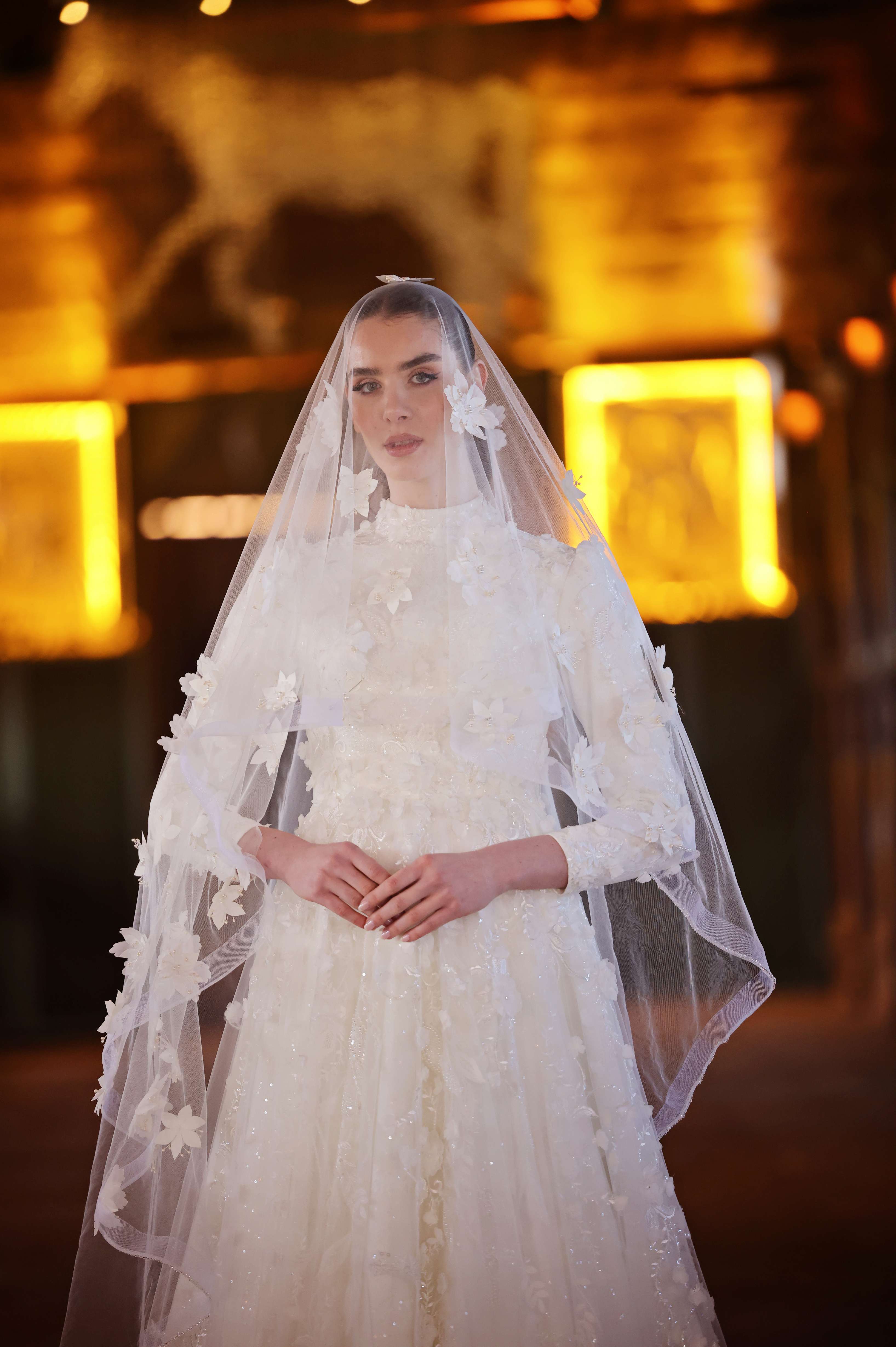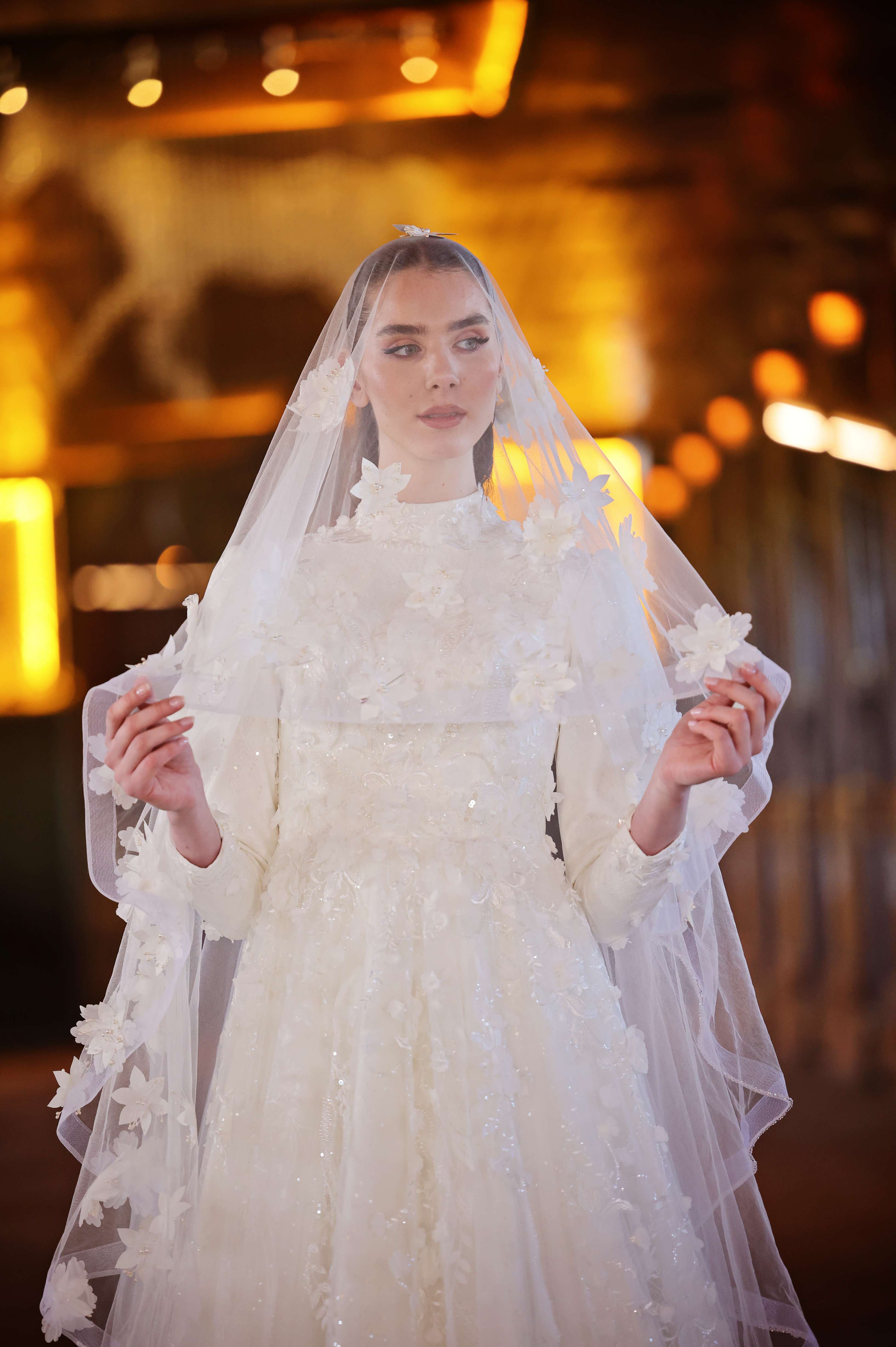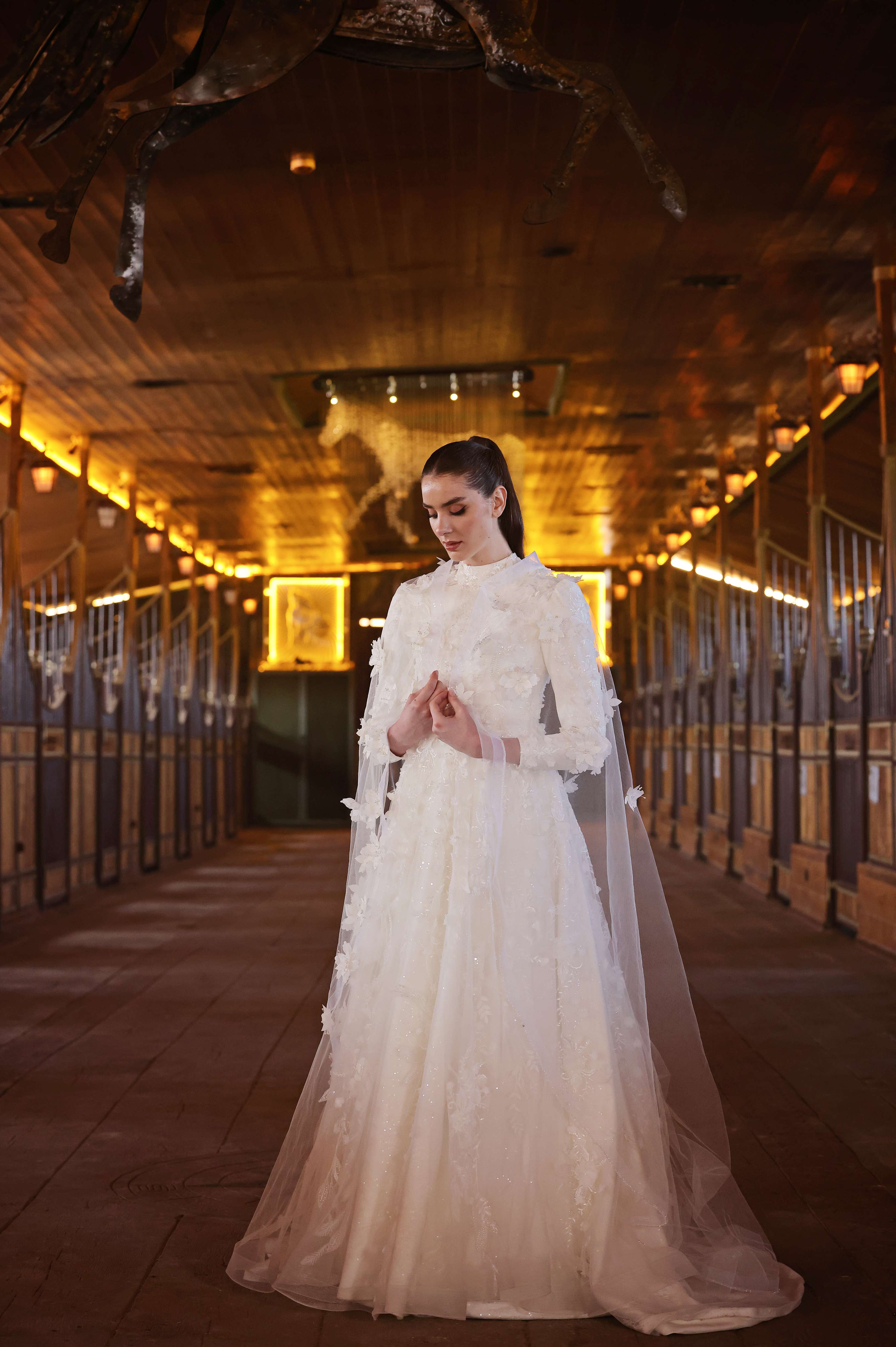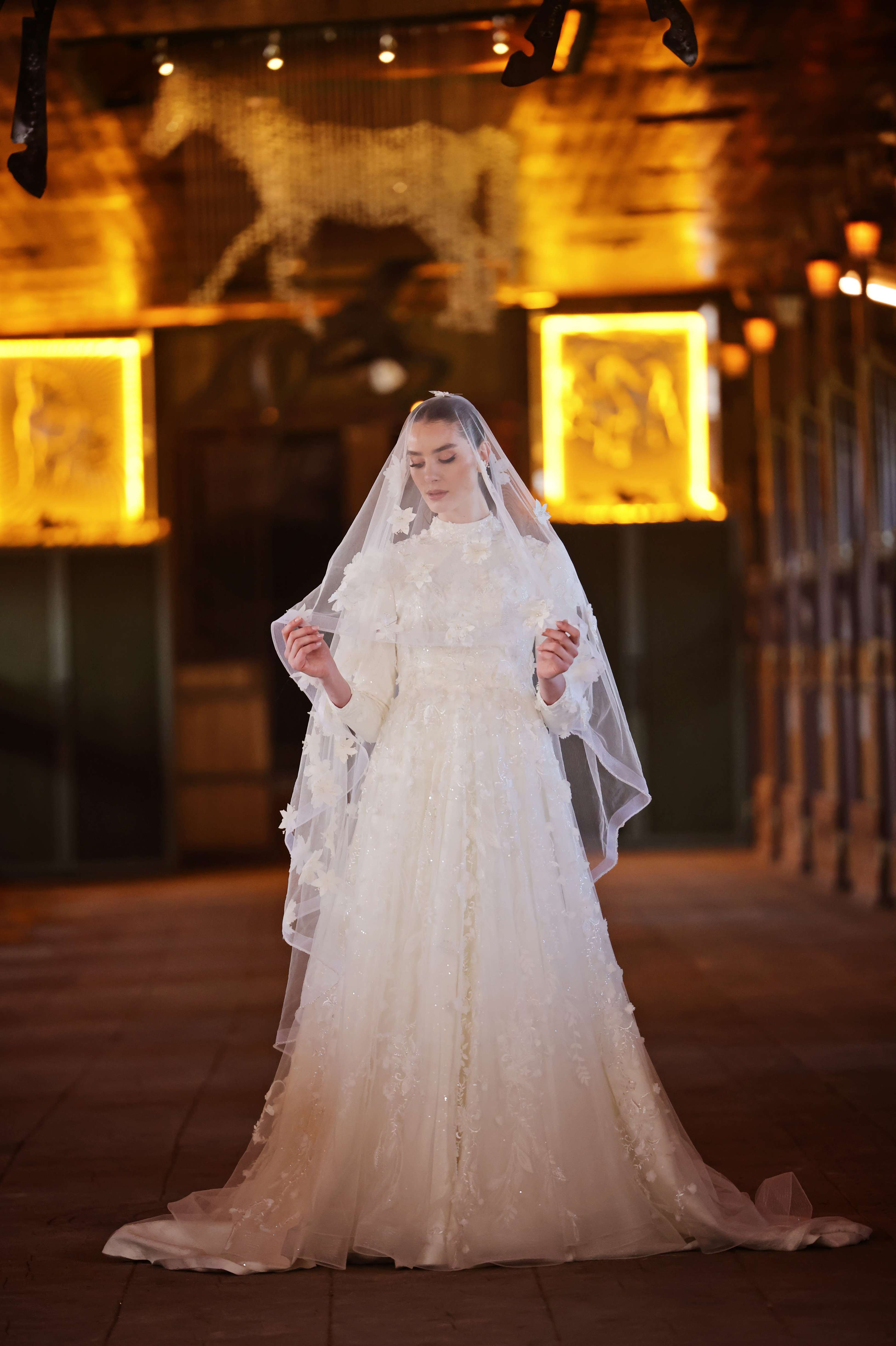 Doğanın büyüsünü yansıtan bu eşsiz gelinlik, 3 boyutlu çiçek işlemeleriyle romantik bir dokunuş sunar. Hafif ve akışkan kumaşı, uzun kolları ve zarif detaylarıyla sofistike bir görünüm sağlar. Etek ve tül pelerin üzerindeki çiçek aplikeleri, düğününüzde masalsı bir hava yaratmanıza yardımcı olur.. Düğün gününüzde sofistike bir zarafetle parlayacak bu gelinlik, her adımda ışıl ışıl bir görünüm sunar.