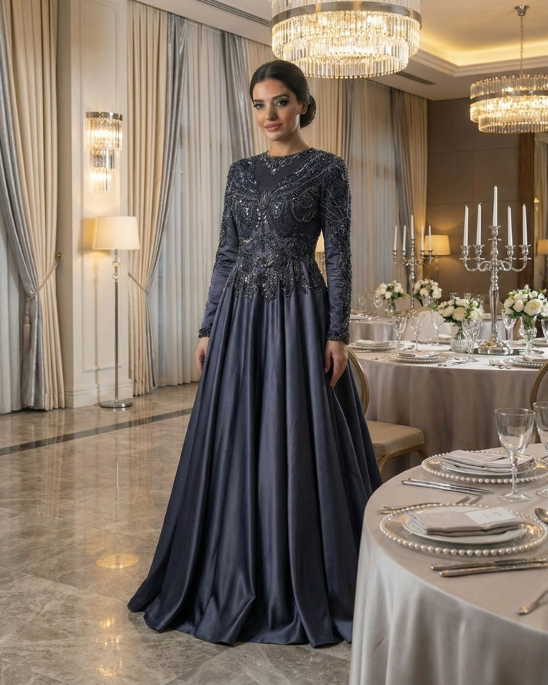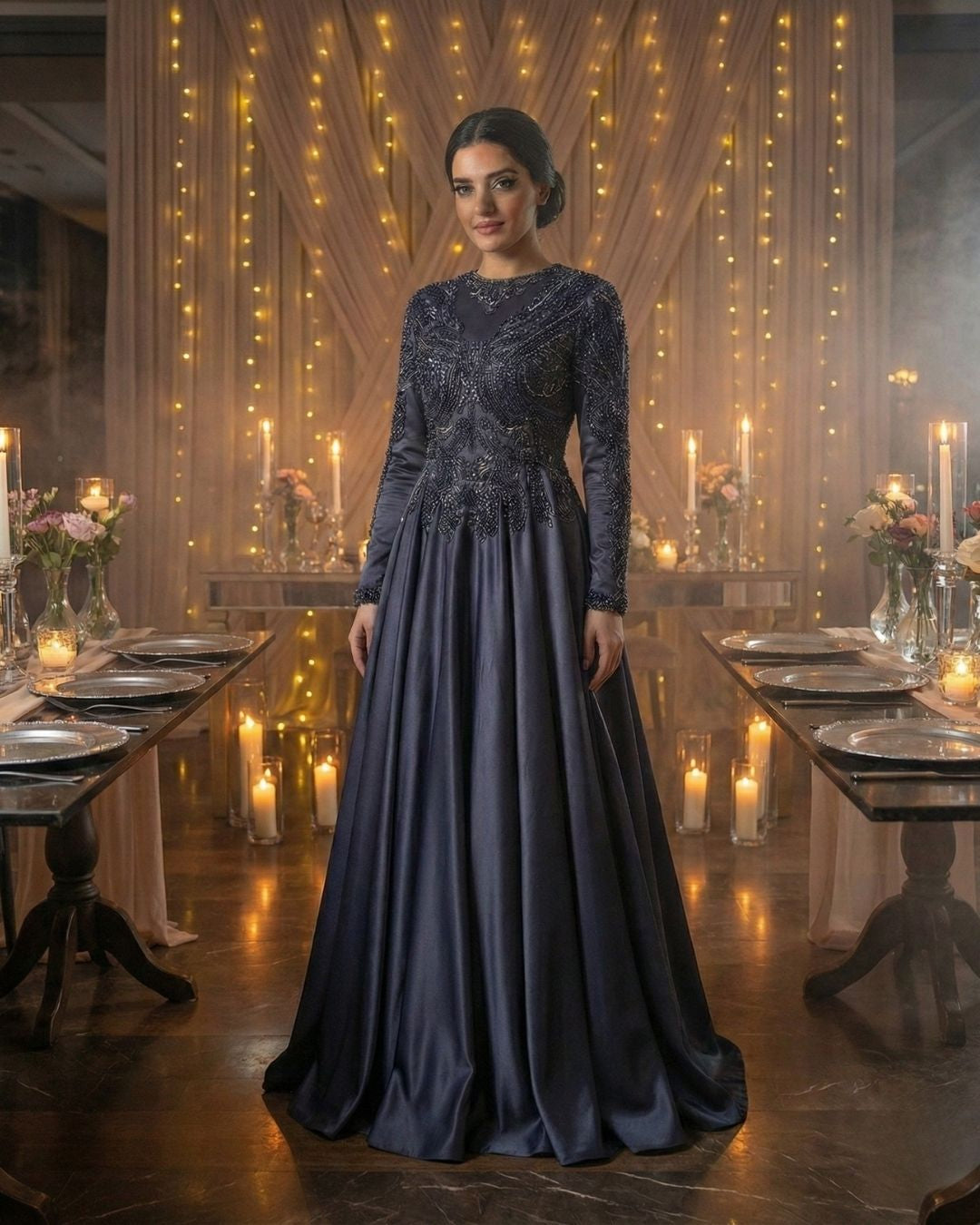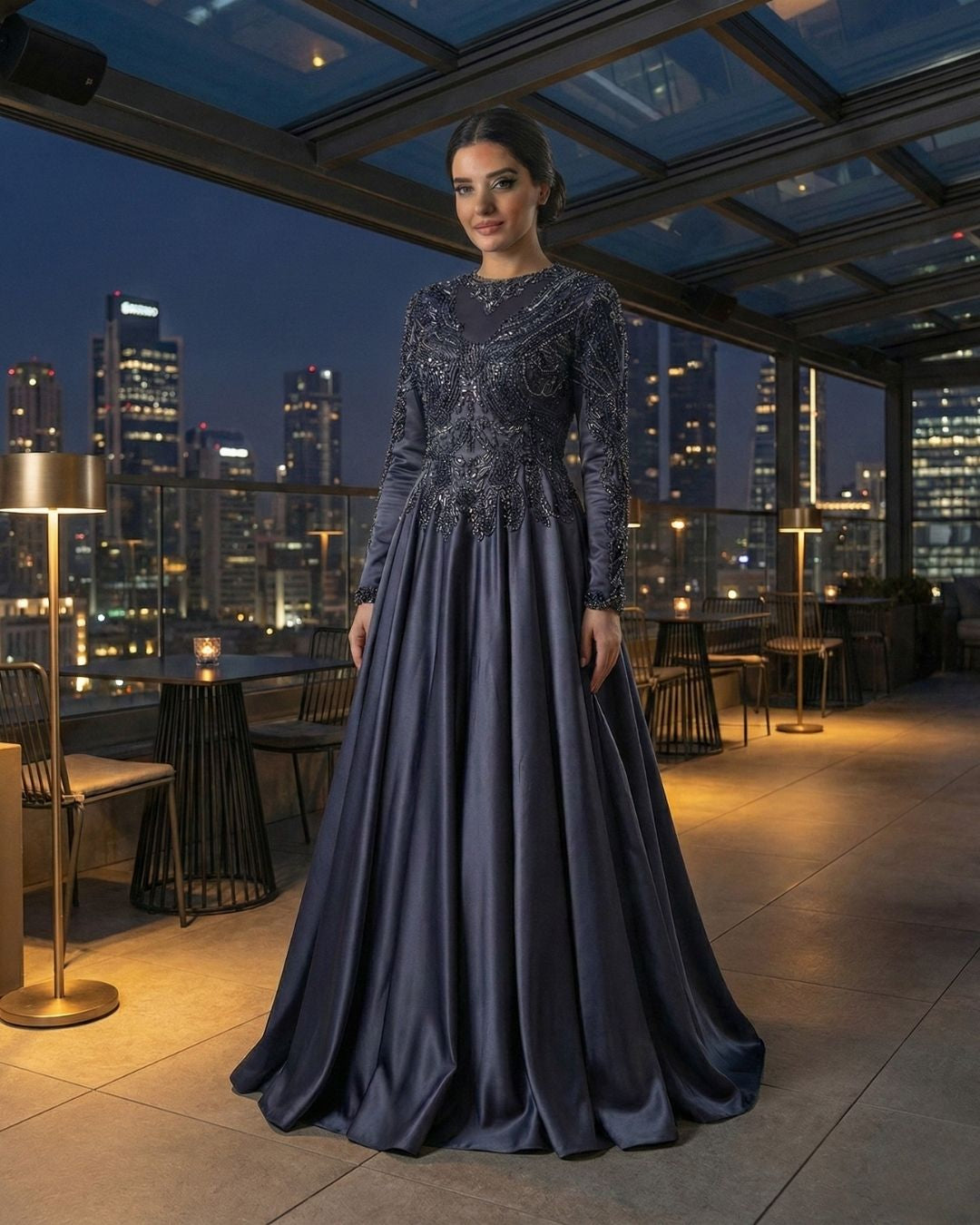 Üst kısmındaki yoğun taş ve dantel işlemeleriyle göz kamaştıran bu antrasit gri abiye elbise, belden aşağıya doğru dökümlü prenses form etek kesimiyle asil bir siluet sunar. Uzun kollu ve transparan detaylı üst tasarımı, elbiseye zarafet ve modern bir şıklık kazandırır. Düğün davetleri, nişanlar ve özel geceler için kusursuz bir tercihtir. Bedeni 38-40 olan numune üründür.
