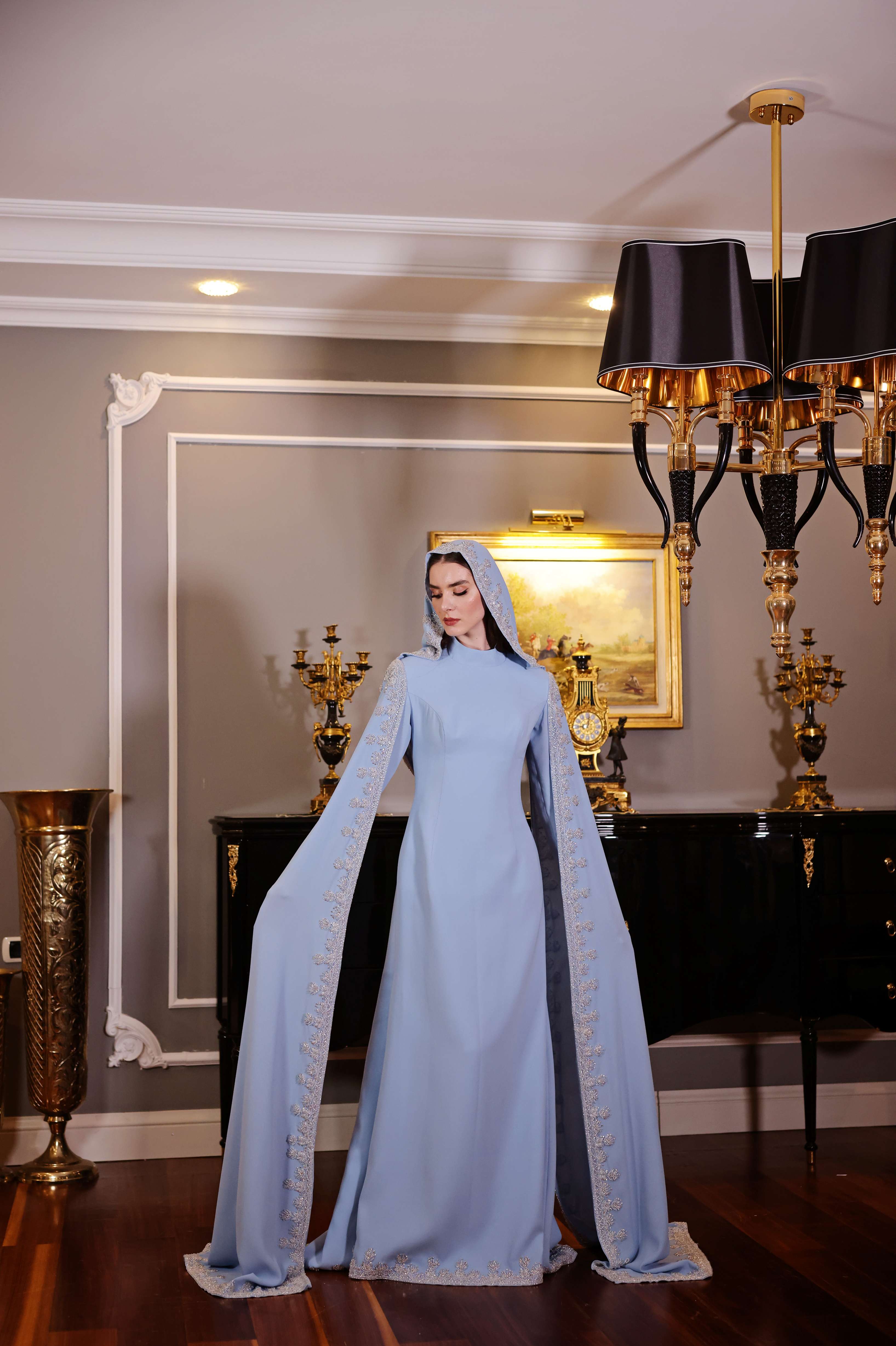 Gökyüzü tonlarındaki bu mavi abiye, zarafetiyle göz kamaştırıyor. Kollarındaki ve etek ucundaki zarif dantel işlemeleri, asil bir şıklık katıyor. Entegre başlık detayıyla modern bir siluete sahip olan bu tasarım, özel davetlerde dikkat çekici bir duruş sunar. Sade formu ile hem klasik hem yenilikçi bir stil yaratmak isteyen kadınlar için ideal bir seçimdir.