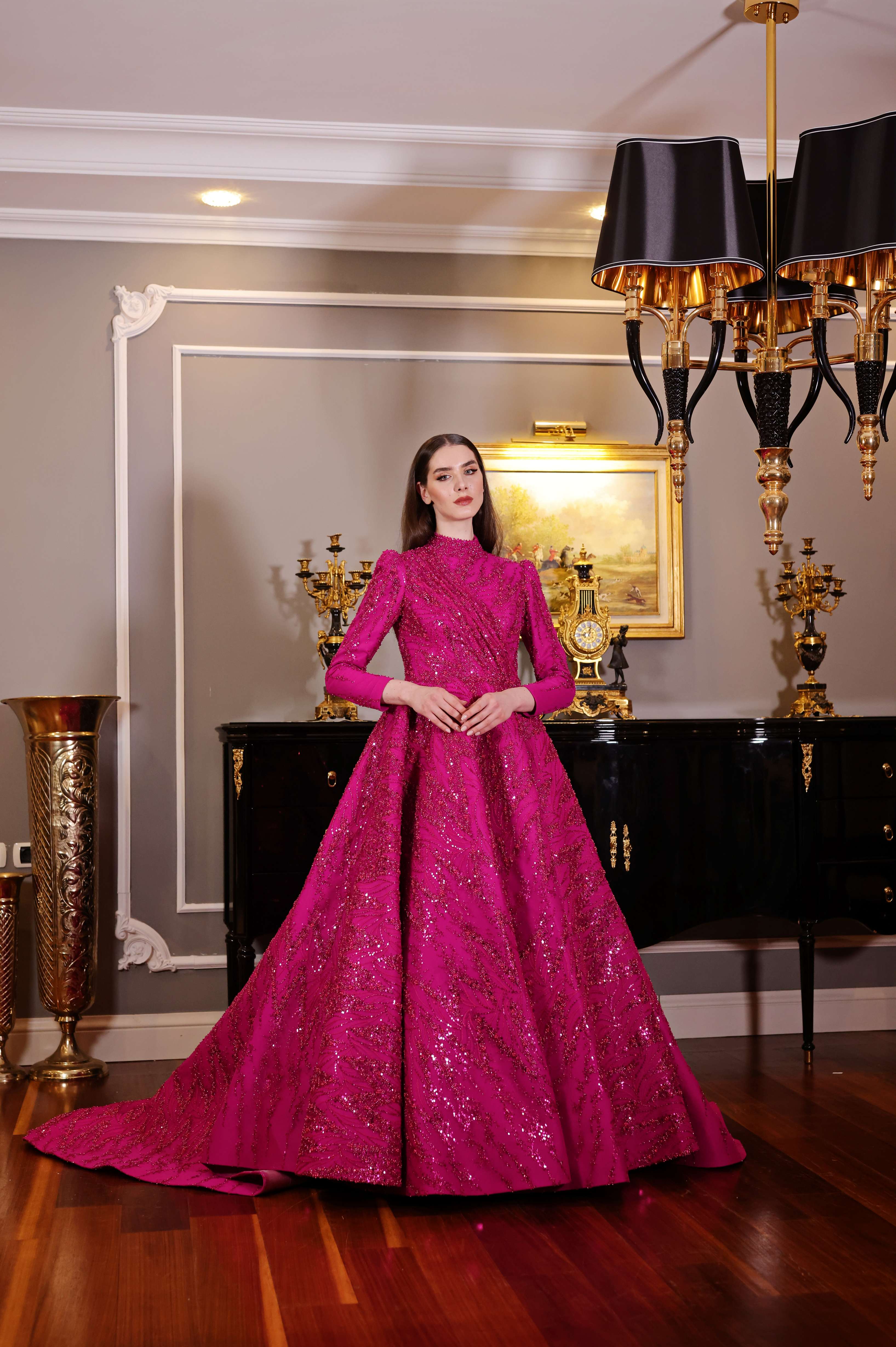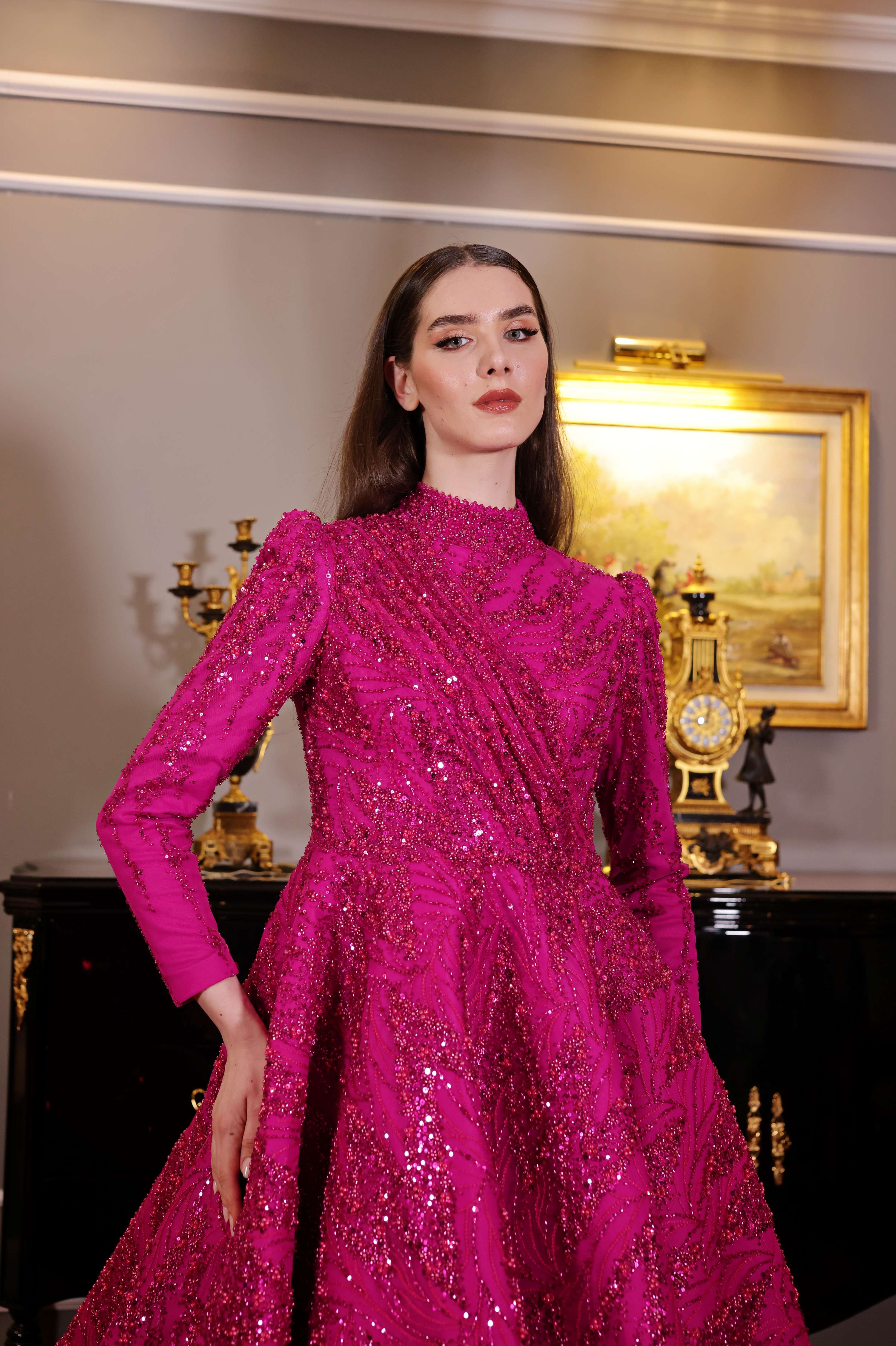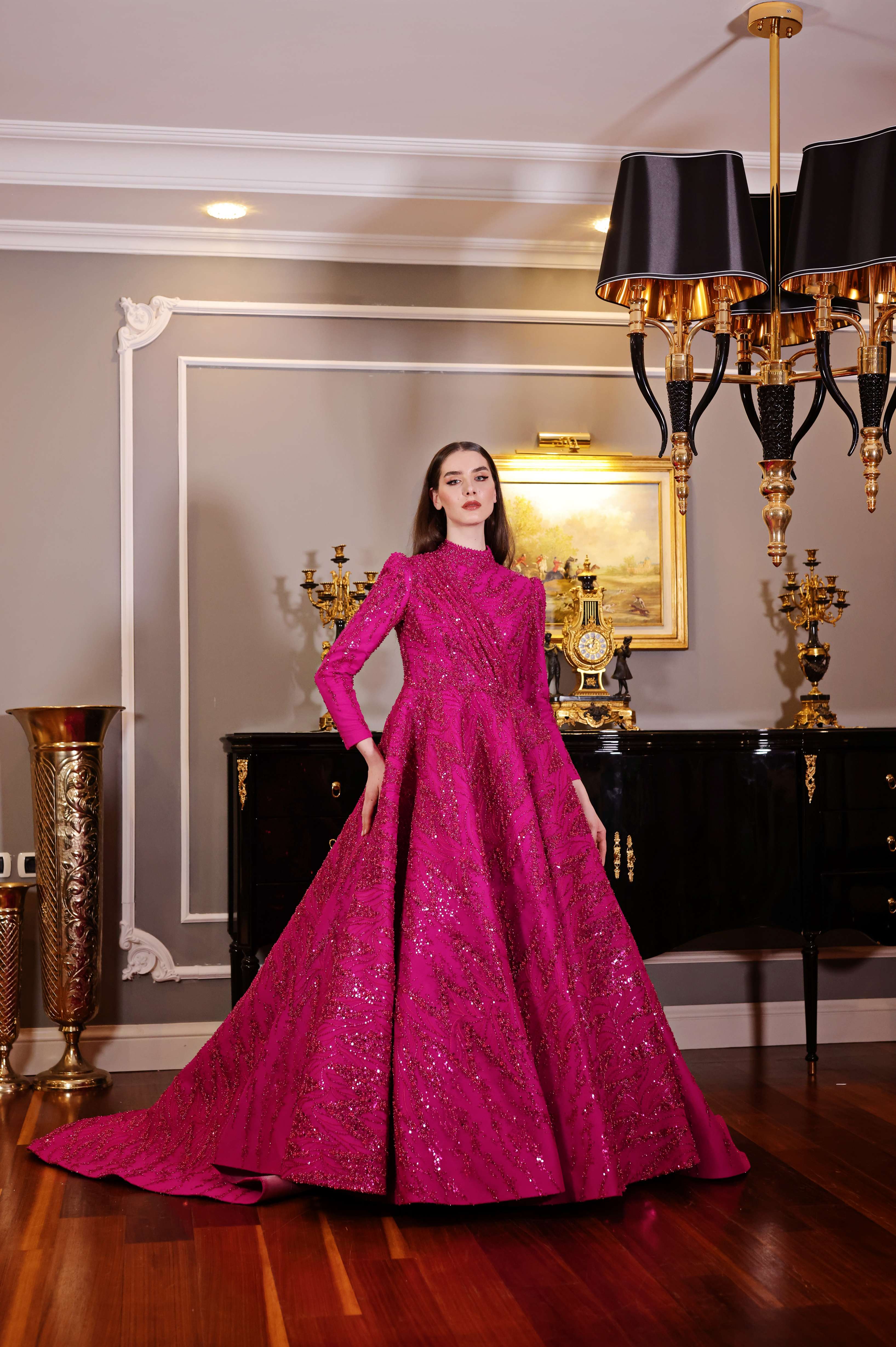 Göz alıcı fuşya rengiyle öne çıkan bu tam kapalı abiye elbise, ışıltılı işlemeleriyle her adımda zarafetinizi yansıtıyor. Yüksek yakası ve uzun kollu tasarımıyla şıklık ve ihtişamı bir araya getirirken, kuyruklu eteğiyle gösterişli davetler için mükemmel bir seçim sunar. Modern çizgilerle tasarlanmış bu elbise, özel günlerde fark edilmek isteyen kadınlar için idealdir.