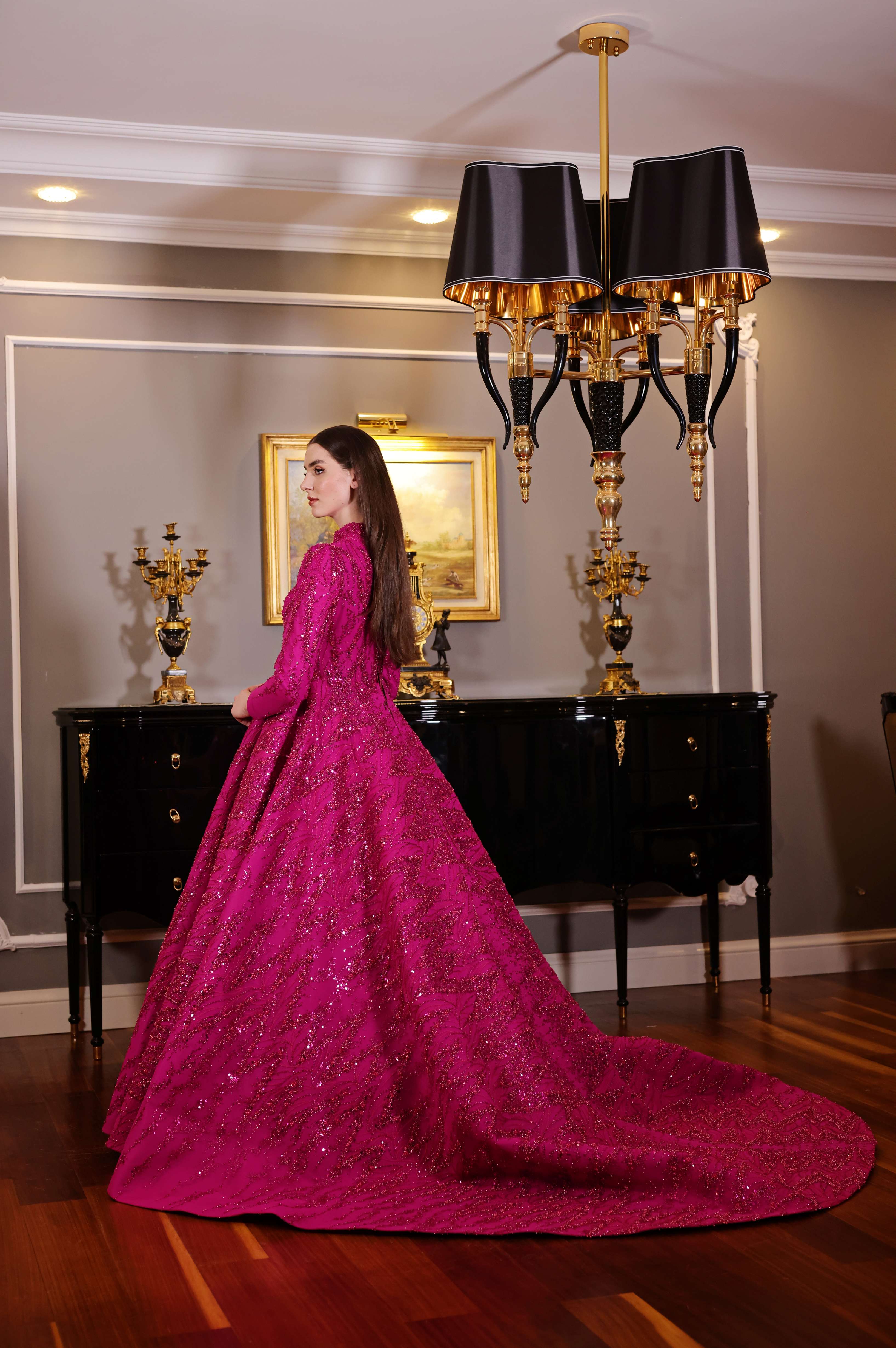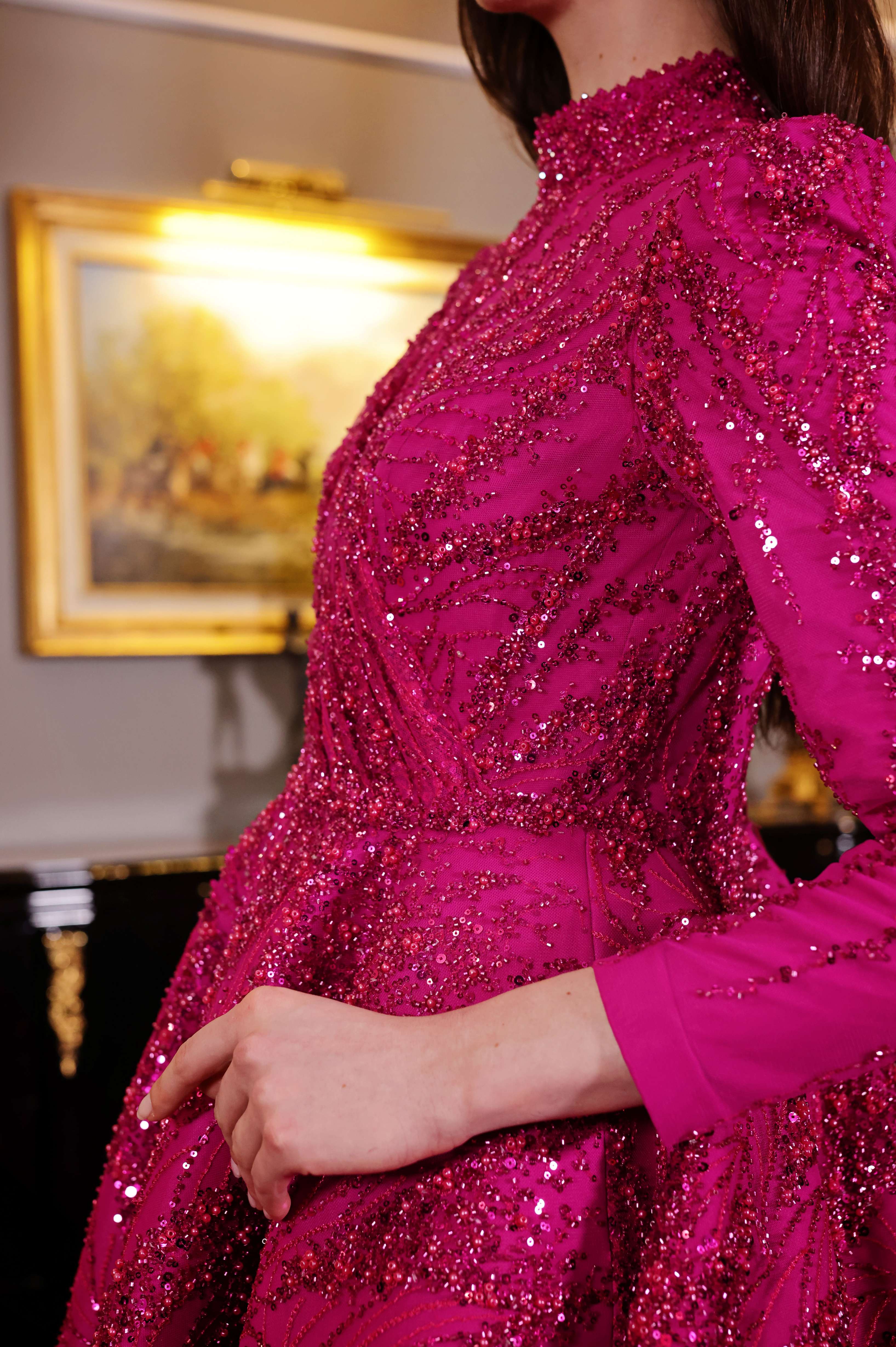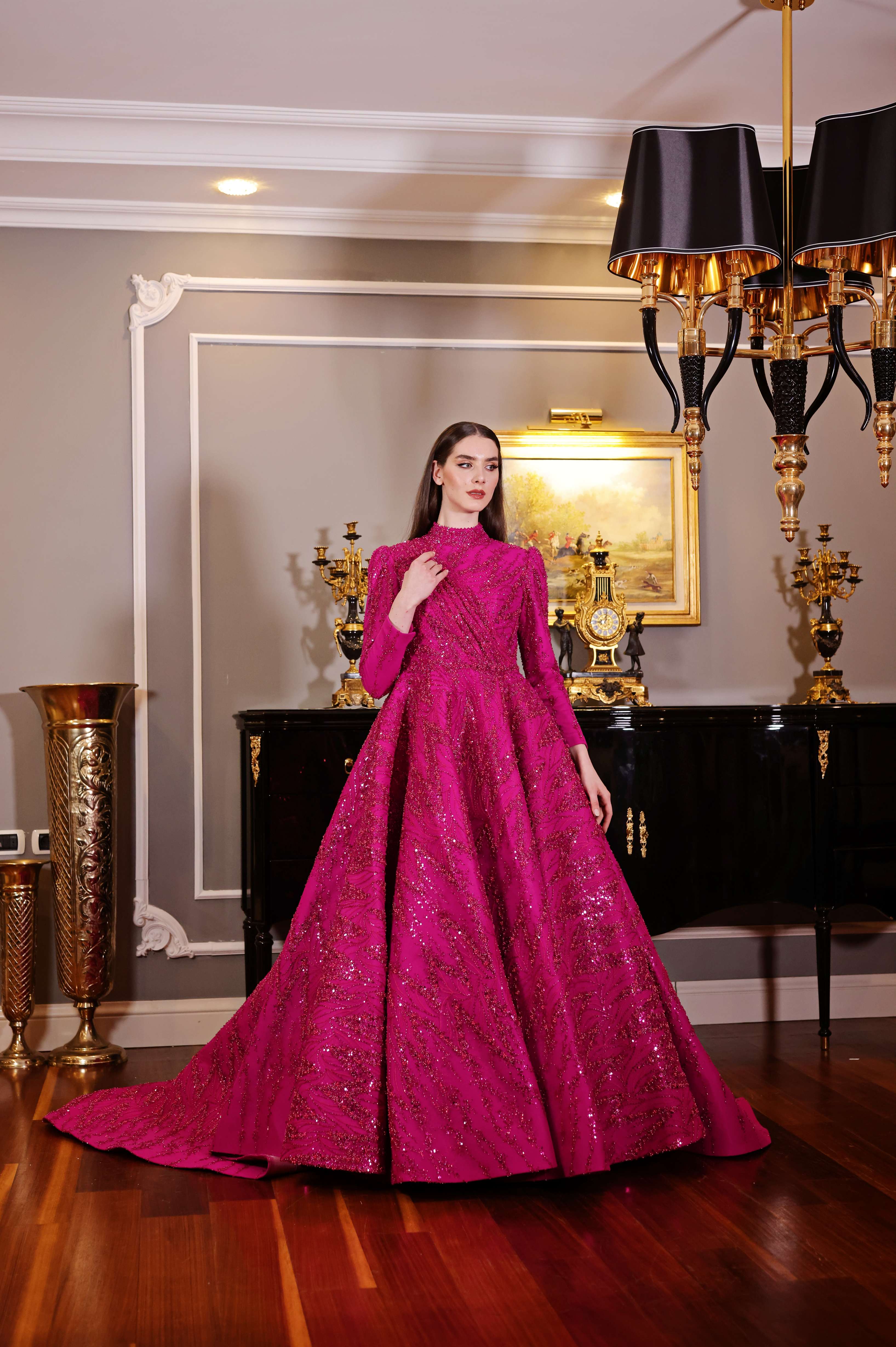 Göz alıcı fuşya rengiyle öne çıkan bu tam kapalı abiye elbise, ışıltılı işlemeleriyle her adımda zarafetinizi yansıtıyor. Yüksek yakası ve uzun kollu tasarımıyla şıklık ve ihtişamı bir araya getirirken, kuyruklu eteğiyle gösterişli davetler için mükemmel bir seçim sunar. Modern çizgilerle tasarlanmış bu elbise, özel günlerde fark edilmek isteyen kadınlar için idealdir.