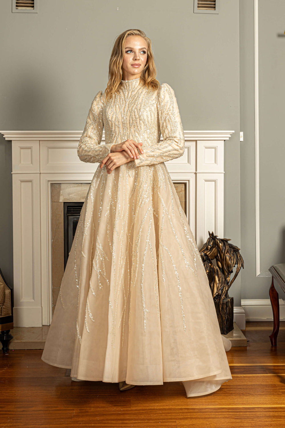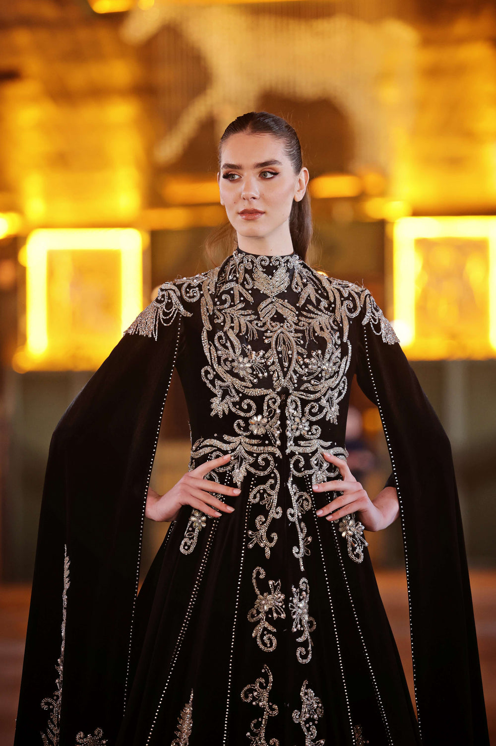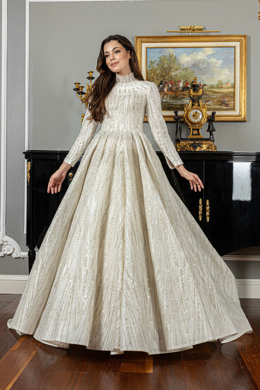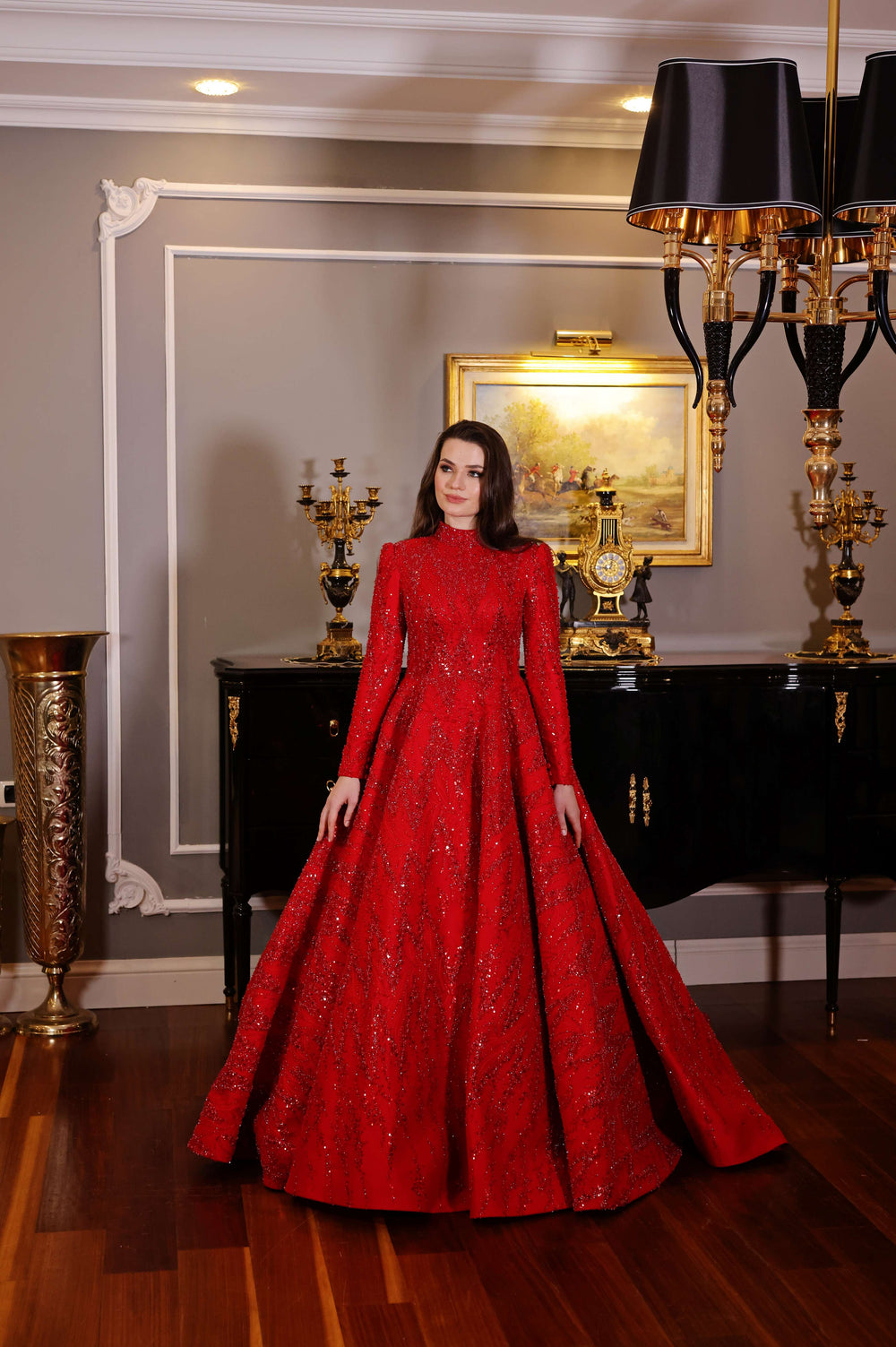 - Işıltılı işlemelerle süslenmiş uzun kollu , yüksek yakalı modern tasarım