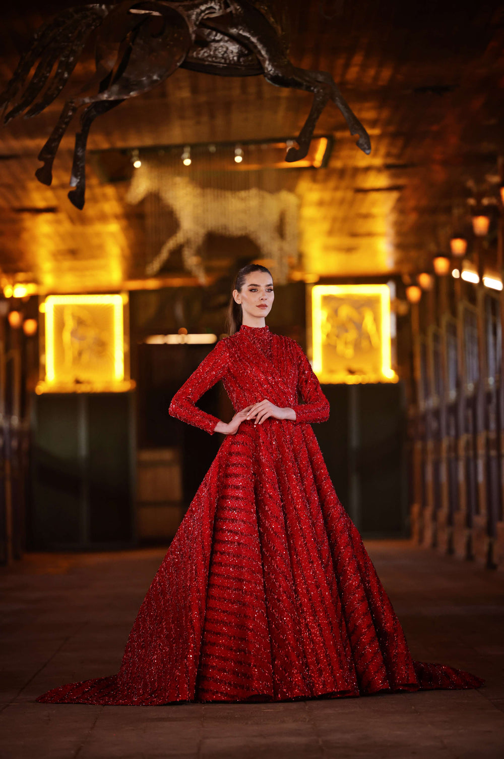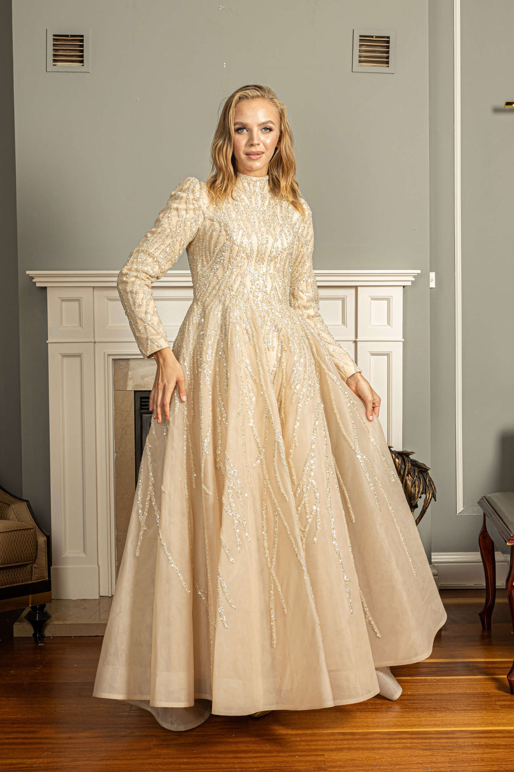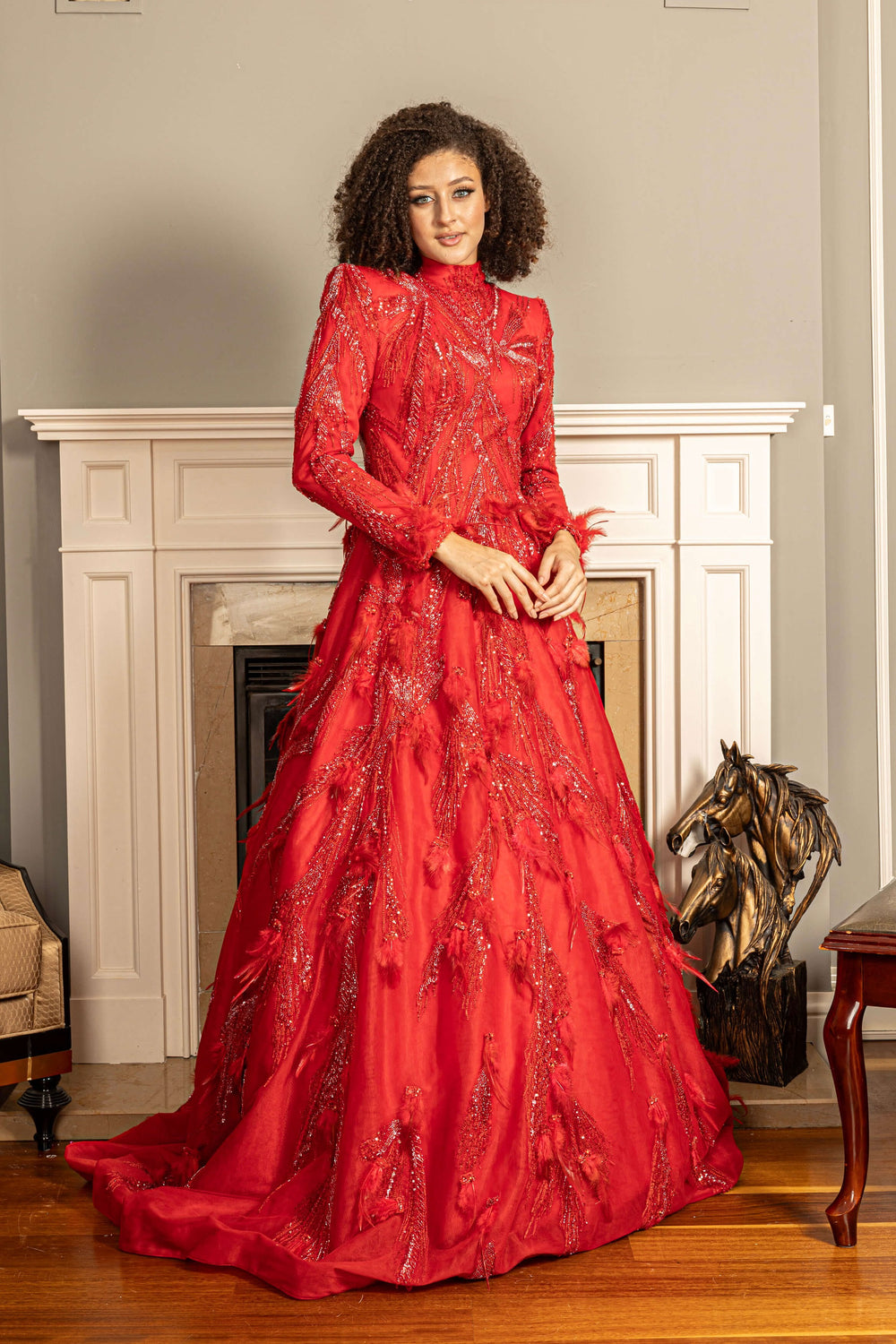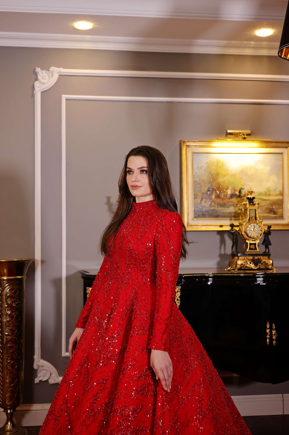 - Işıltılı işlemelerle süslenmiş uzun kollu , yüksek yakalı modern tasarım