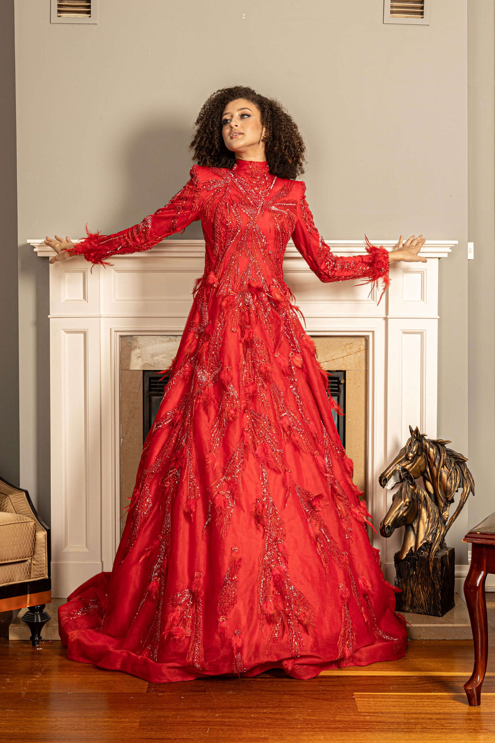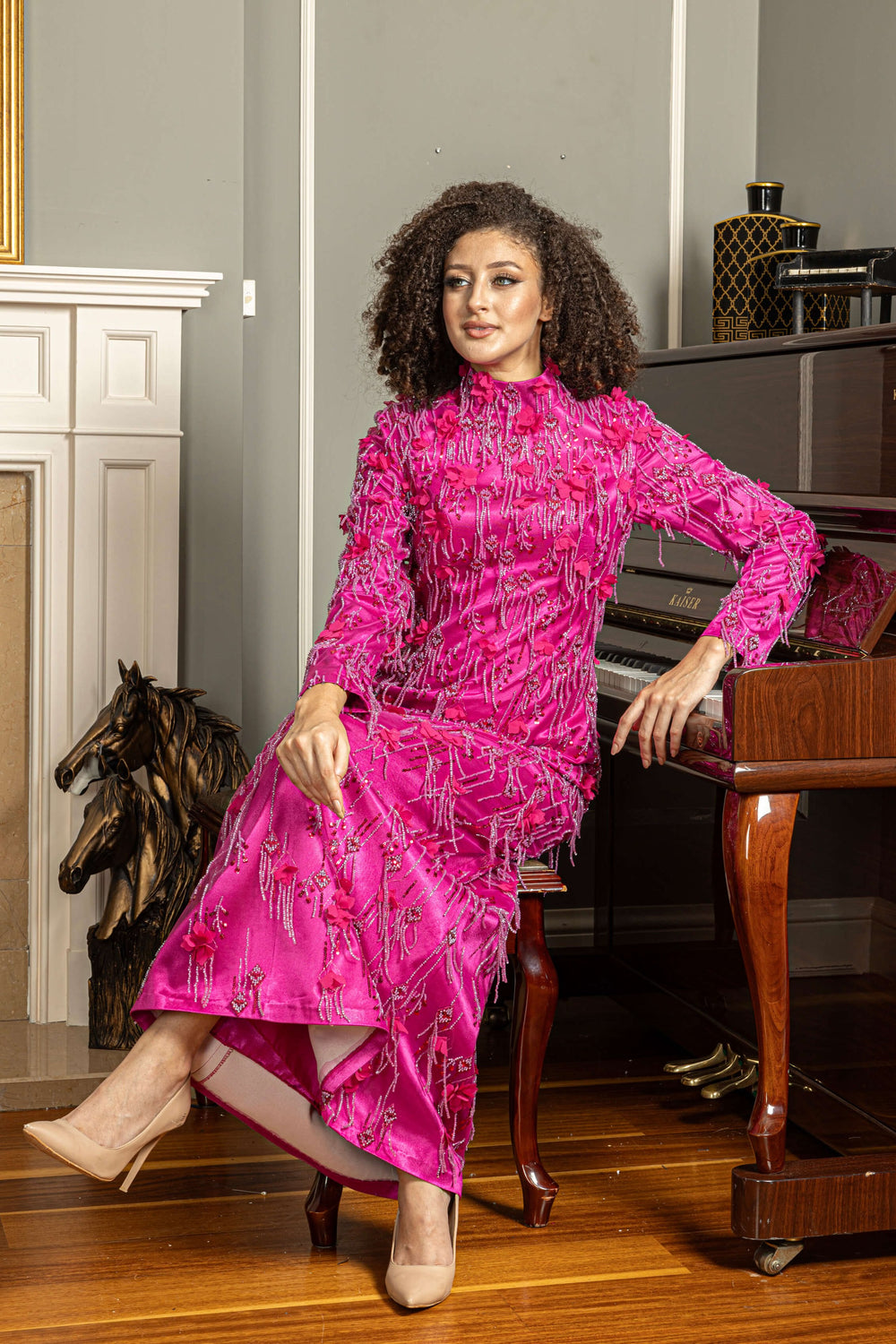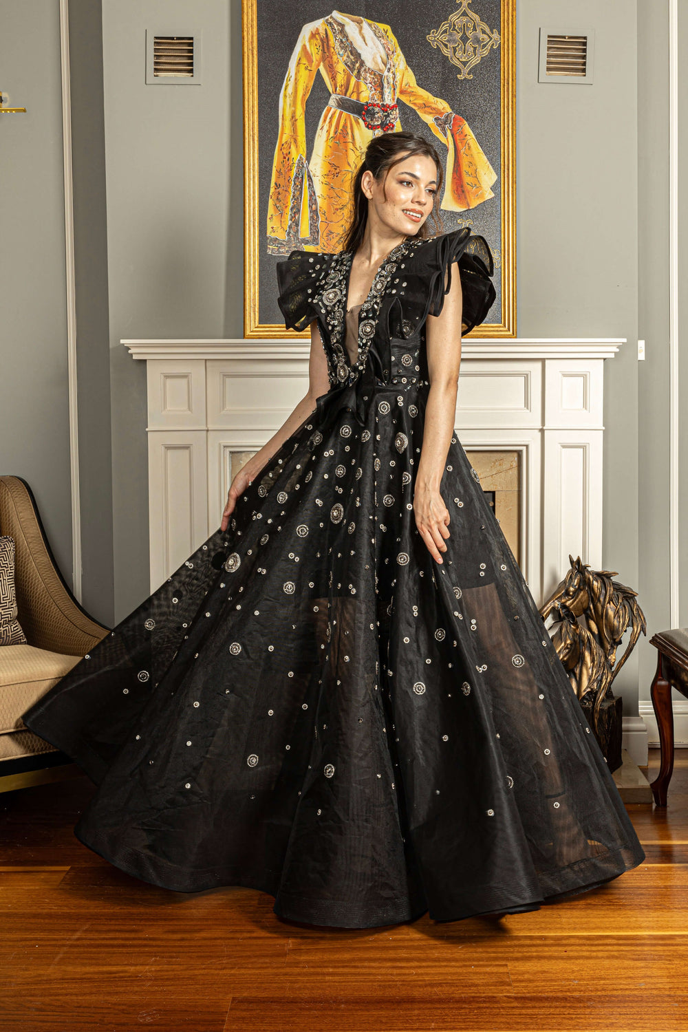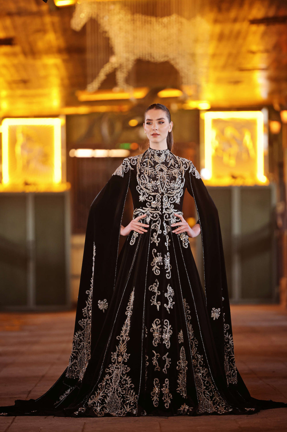 - Işıltılı işlemelerle süslenmiş uzun kollu , yüksek yakalı modern tasarım