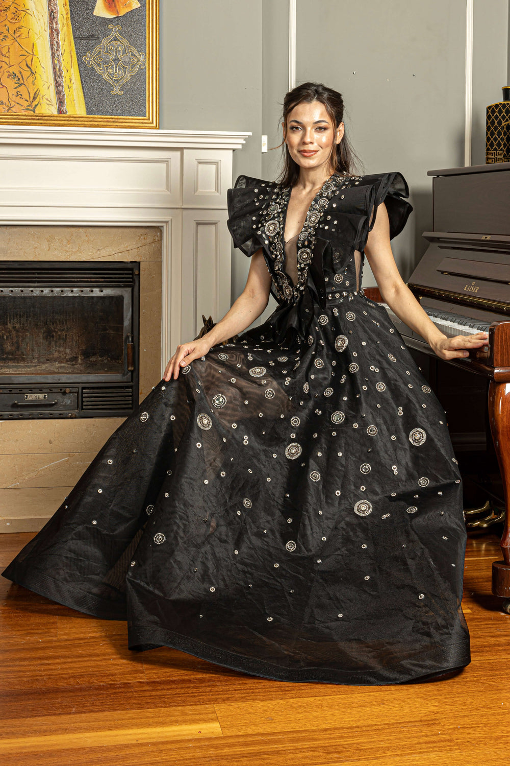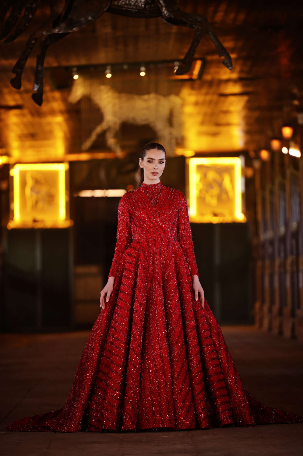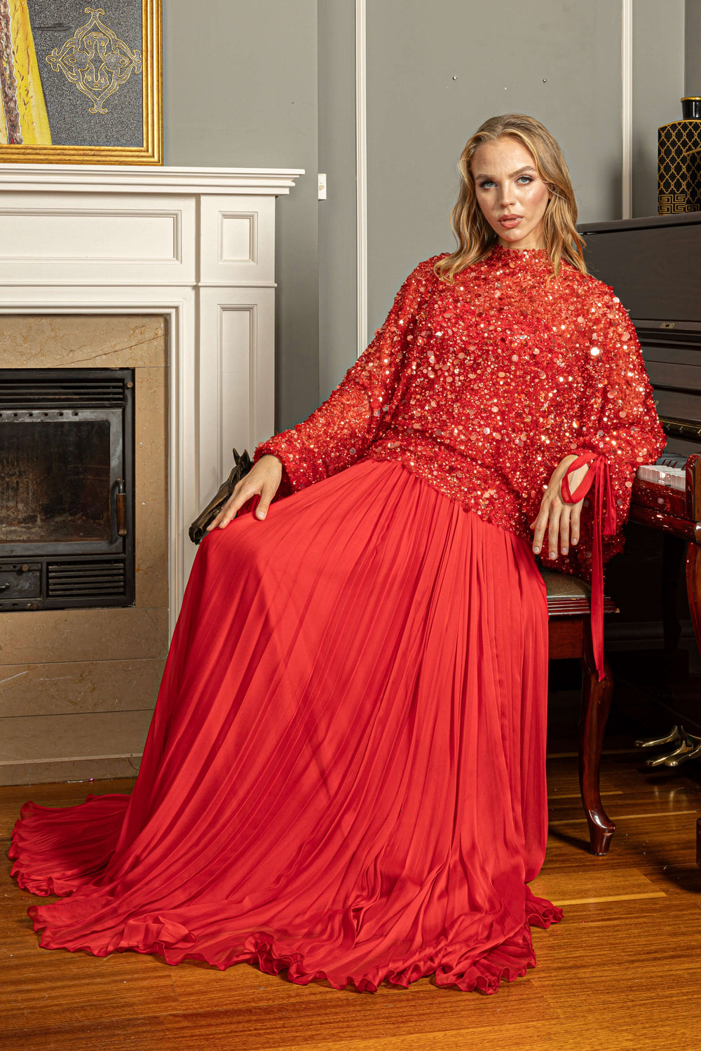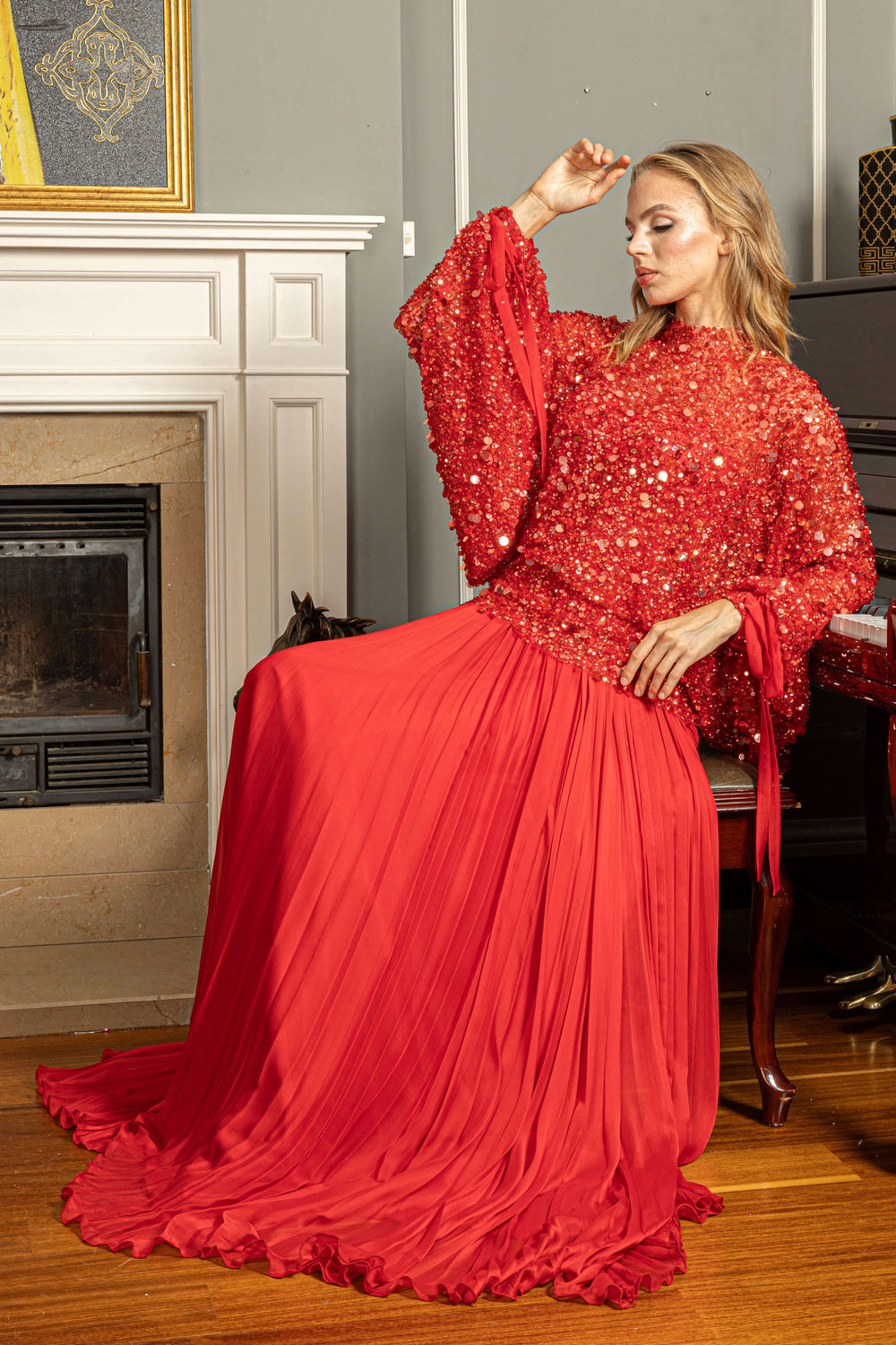 - Işıltılı işlemelerle süslenmiş uzun kollu , yüksek yakalı modern tasarım