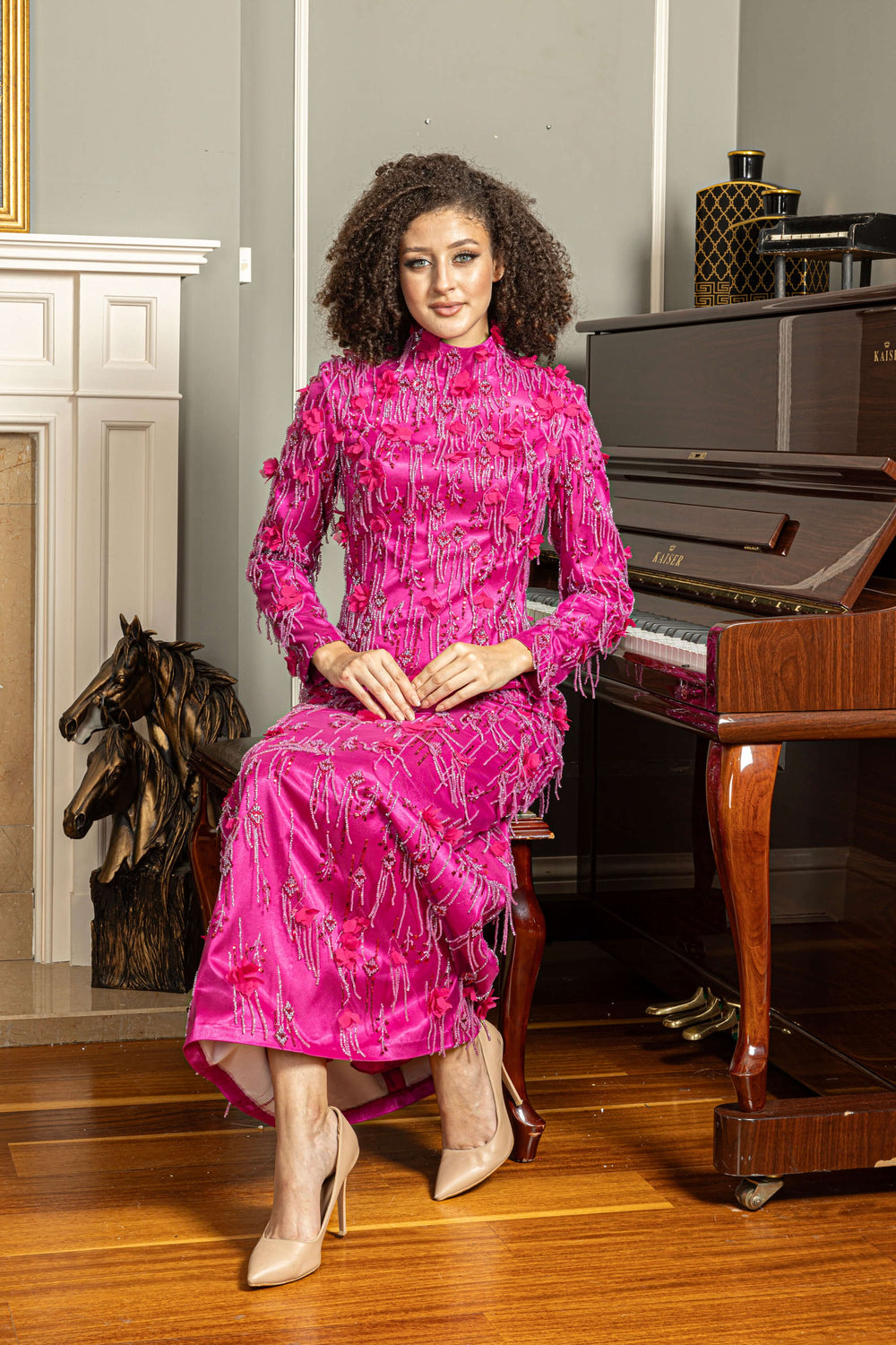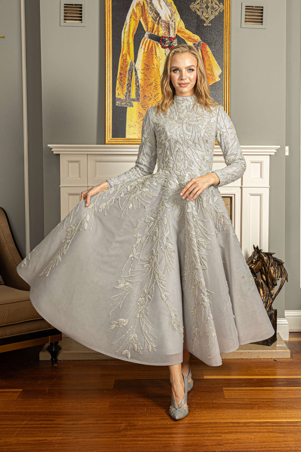 Dantel dizaynı ve zarif işlemeleriyle ön plana çıkan bu midi boy abiye elbise, şıklık ve zarafeti bir arada sunuyor. İnce detaylarla işlenmiş tasarımı, uzun kollu modeli ve yüksek yaka kesimiyle modern bir hava katıyor. Özel davetler, nişan, düğün gibi organizasyonlar için ideal bir seçenek olan bu elbise, rahat kumaş dokusuyla hem şık hem de konforlu bir kullanım sağlar. Kaliteli işçiliği ve göz alıcı detaylarıyla unutulmaz bir stil yaratır.