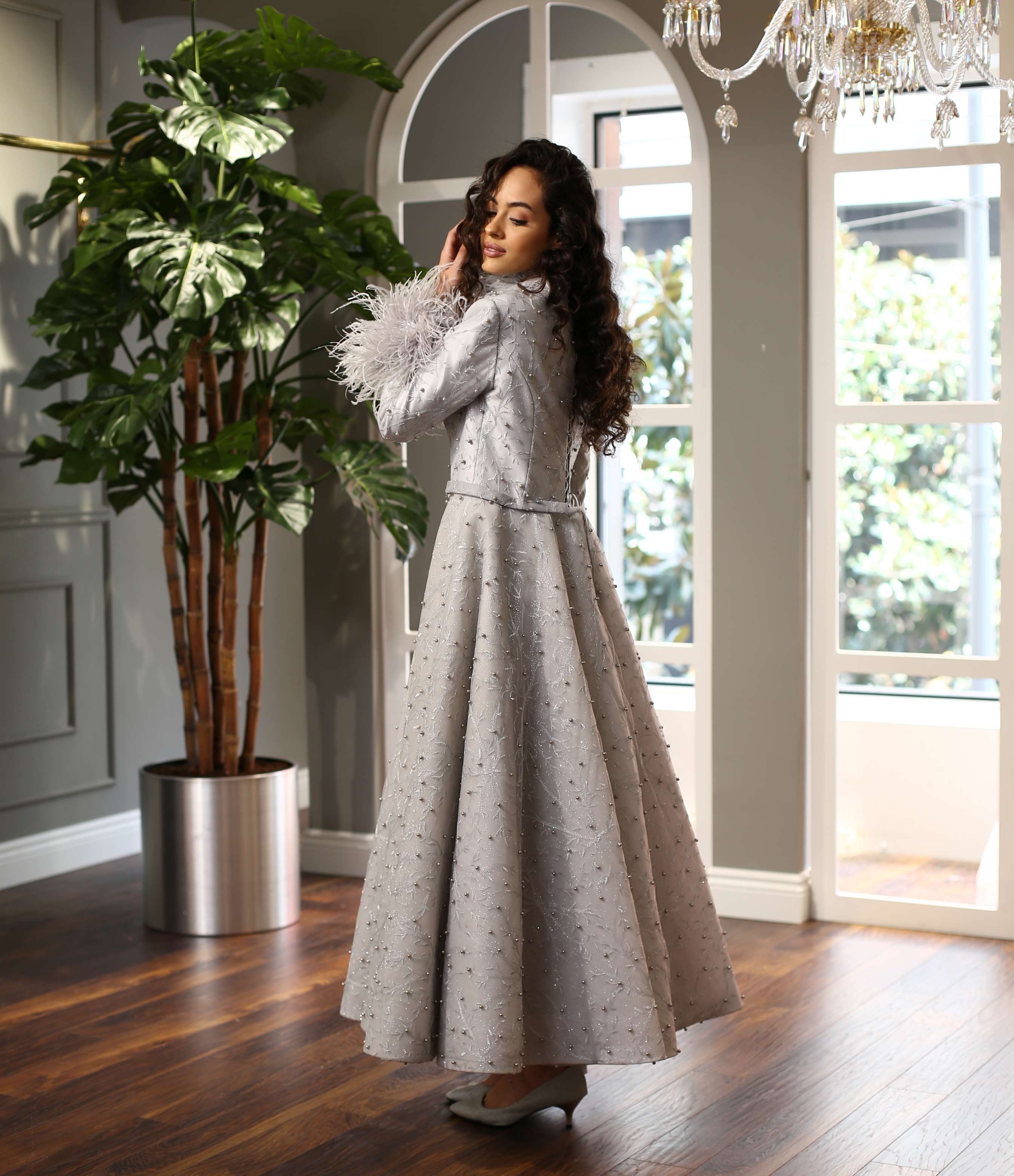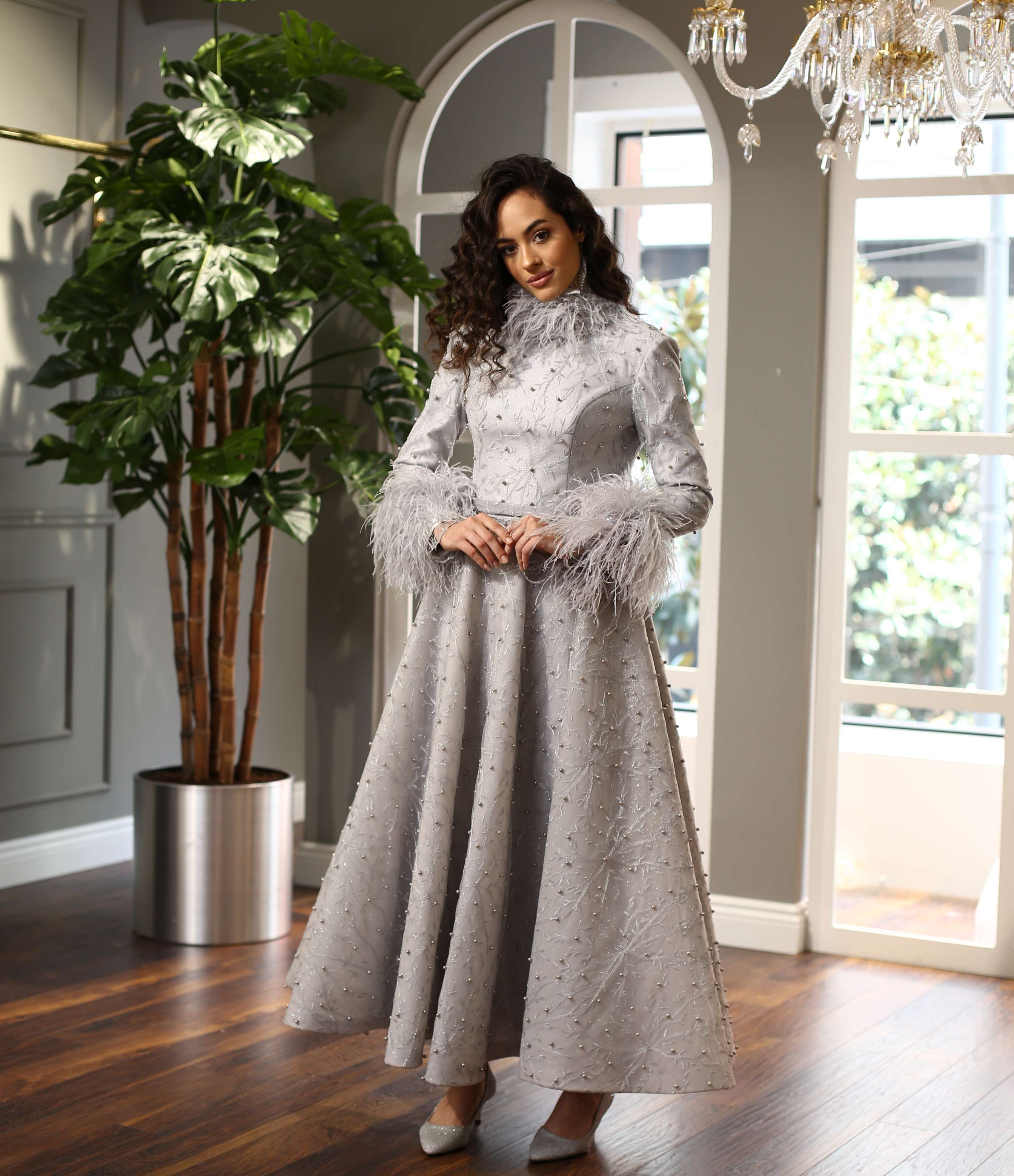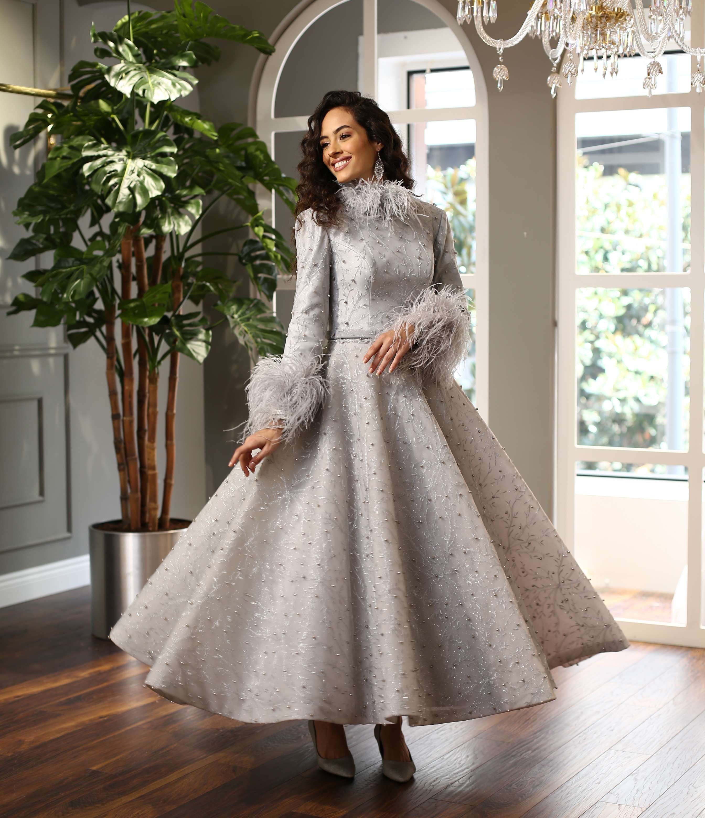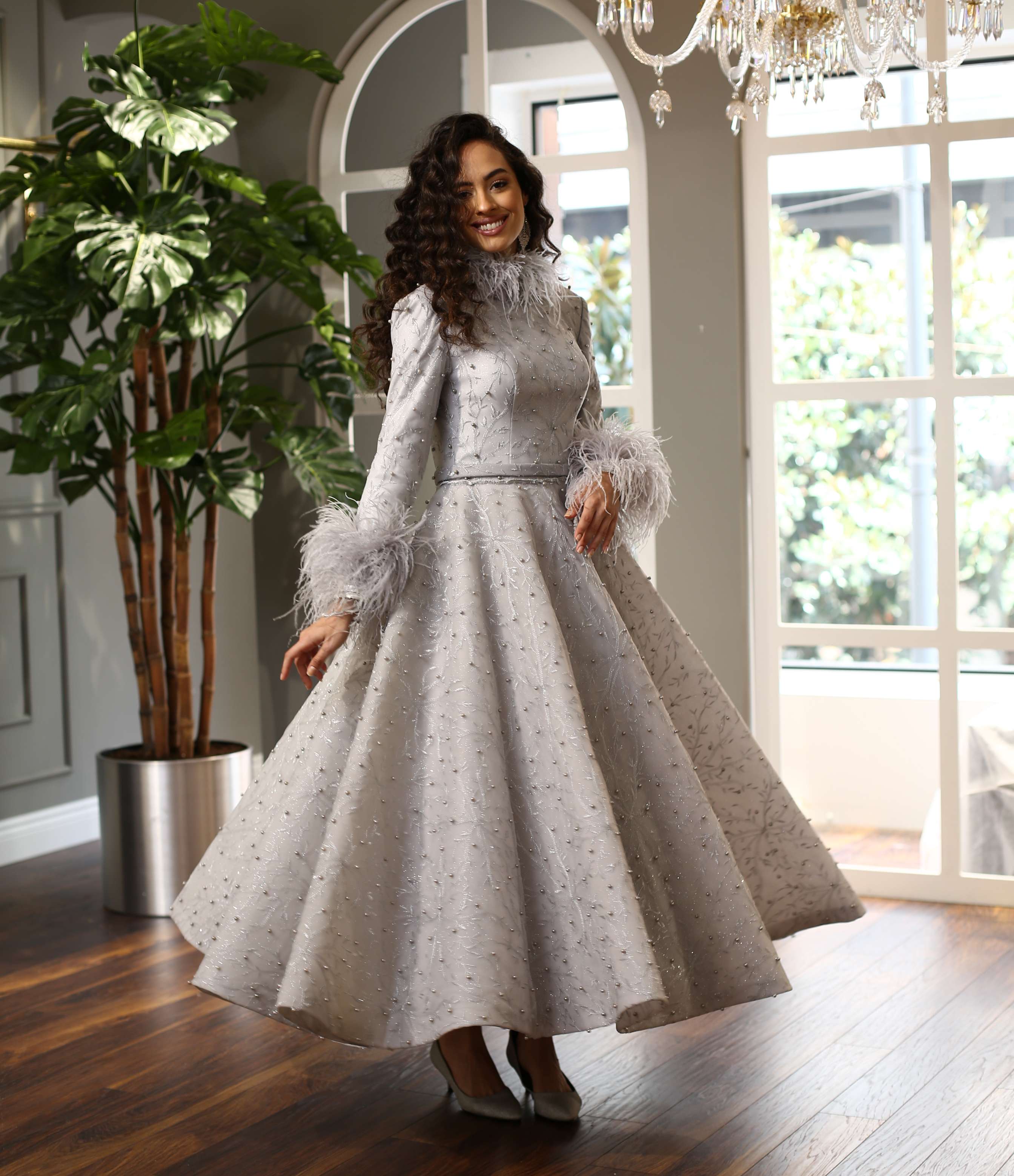 Zarif işleme detaylarıyla zenginleştirilmiş parlak simli işlemeli dantel kumaştan tasarlanan bu gri abiye elbise, sofistike ve iddialı bir şıklık sunar. Yüksek yaka ve uzun kol tasarımı klasik bir duruş sağlarken, kol uçlarındaki tüylü manşet detayları elbiseye modern ve dikkat çekici bir hava katar. Belden oturtmalı kesimi ve geniş A form eteği feminen bir silüet oluşturur. Akıcı dokusu sayesinde konforlu bir kullanım sunan bu özel tasarım; nişan, kına gecesi ve seçkin davetler için mükemmel bir tercihtir.