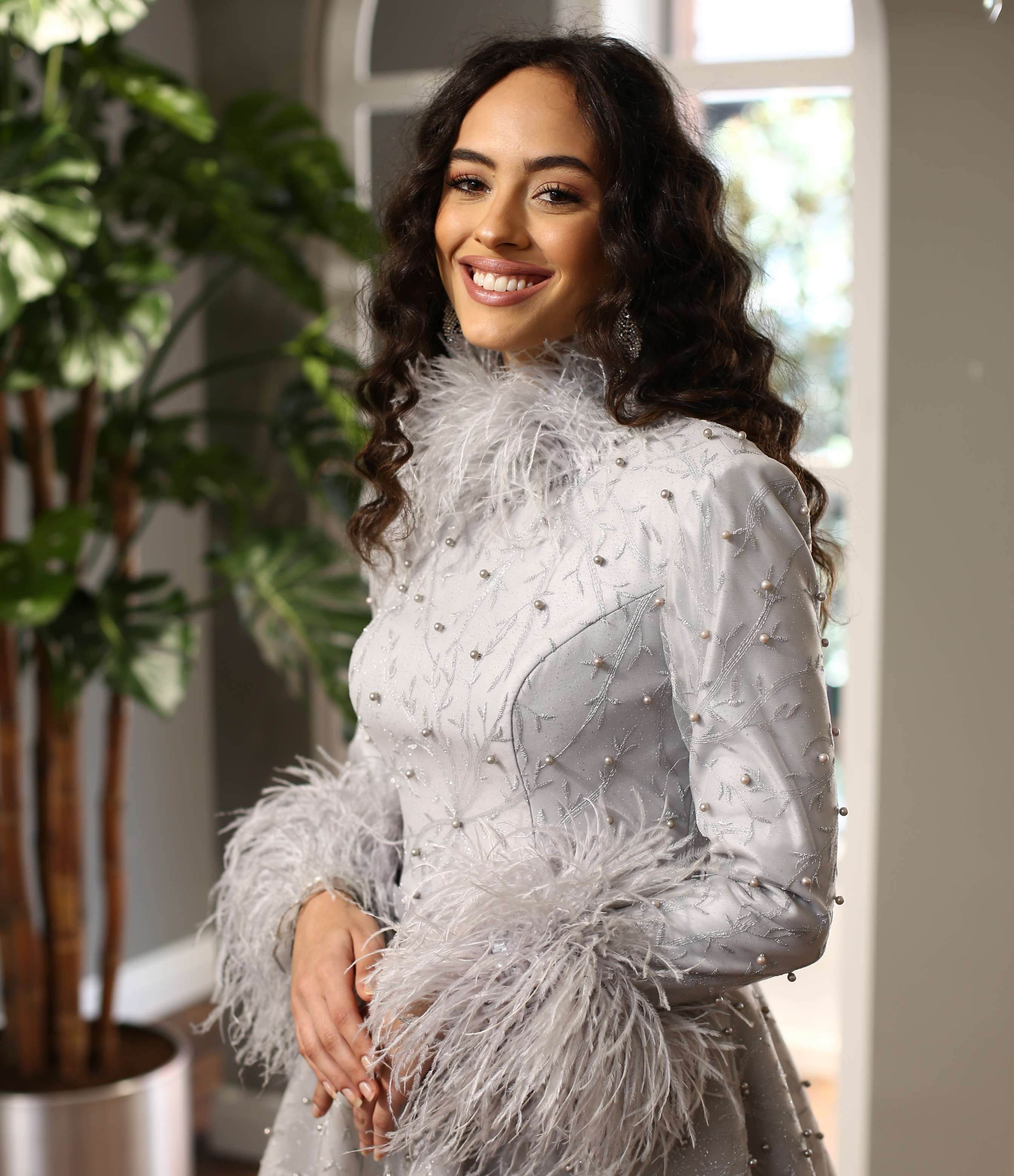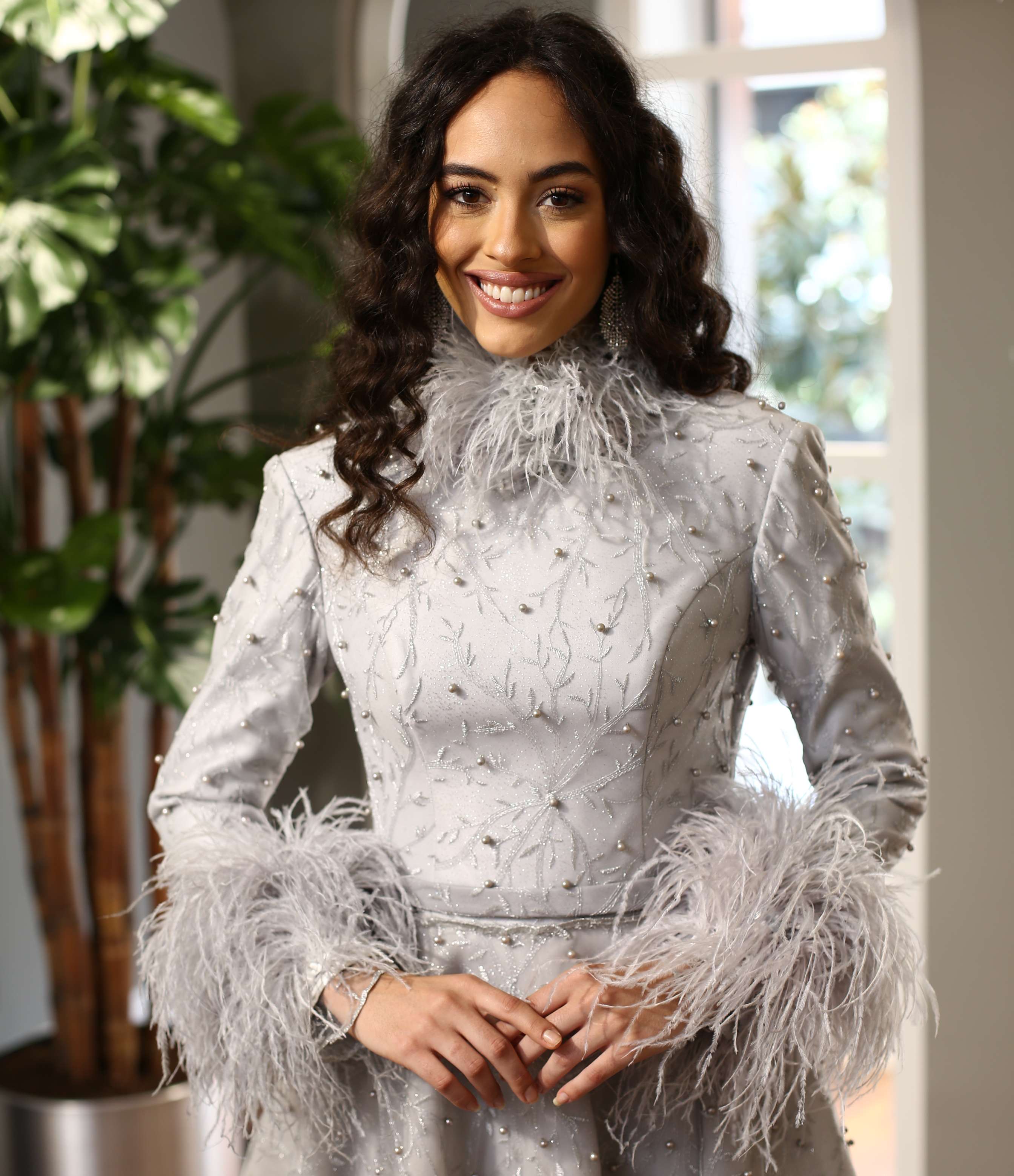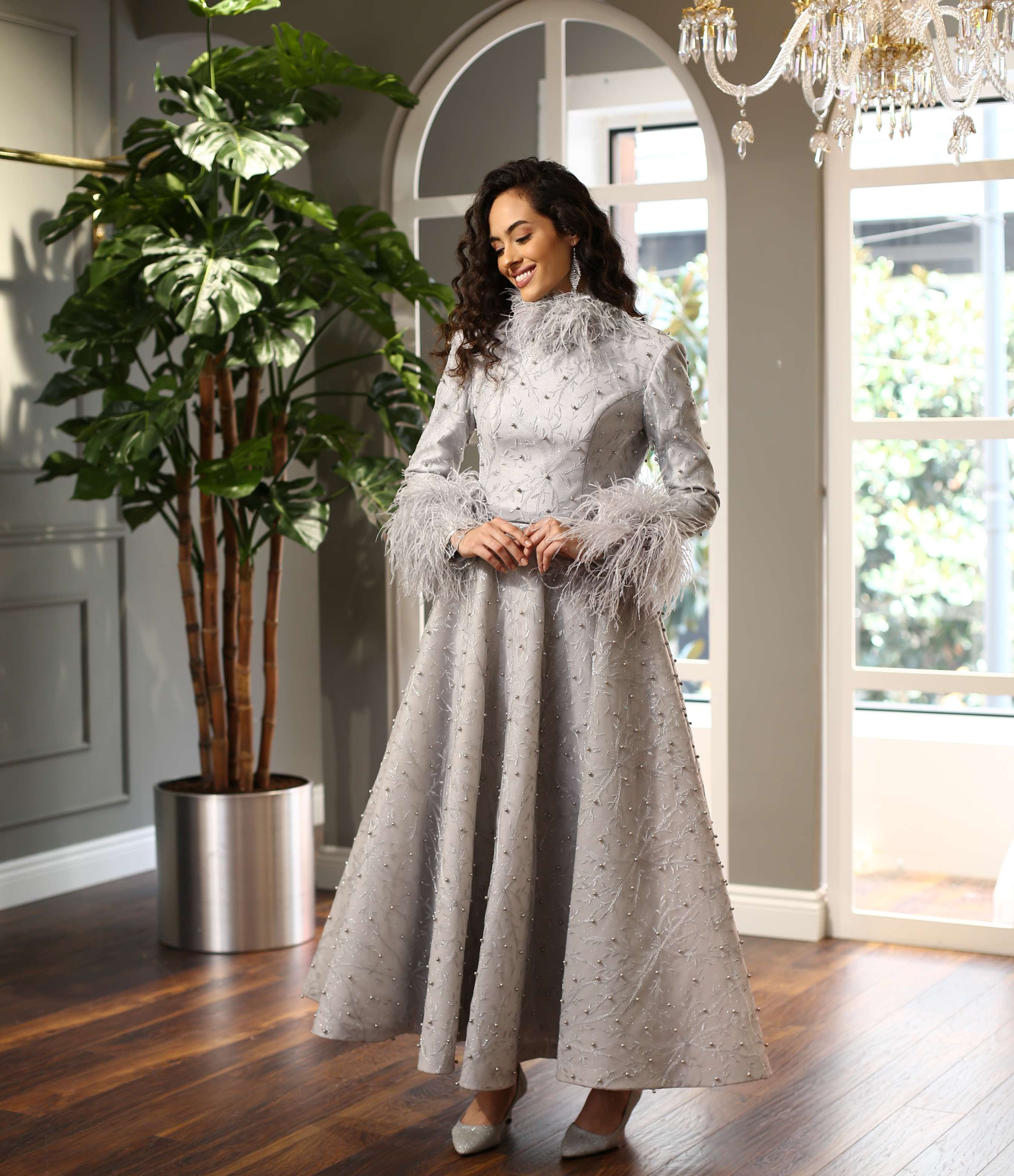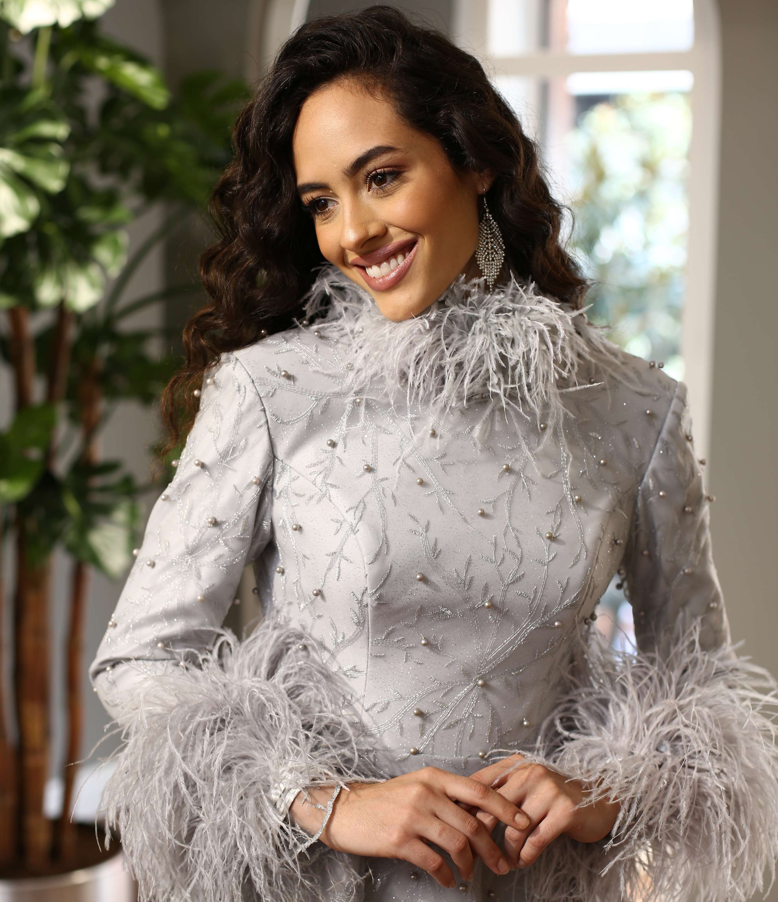 Zarif işleme detaylarıyla zenginleştirilmiş parlak simli işlemeli dantel kumaştan tasarlanan bu gri abiye elbise, sofistike ve iddialı bir şıklık sunar. Yüksek yaka ve uzun kol tasarımı klasik bir duruş sağlarken, kol uçlarındaki tüylü manşet detayları elbiseye modern ve dikkat çekici bir hava katar. Belden oturtmalı kesimi ve geniş A form eteği feminen bir silüet oluşturur. Akıcı dokusu sayesinde konforlu bir kullanım sunan bu özel tasarım; nişan, kına gecesi ve seçkin davetler için mükemmel bir tercihtir.