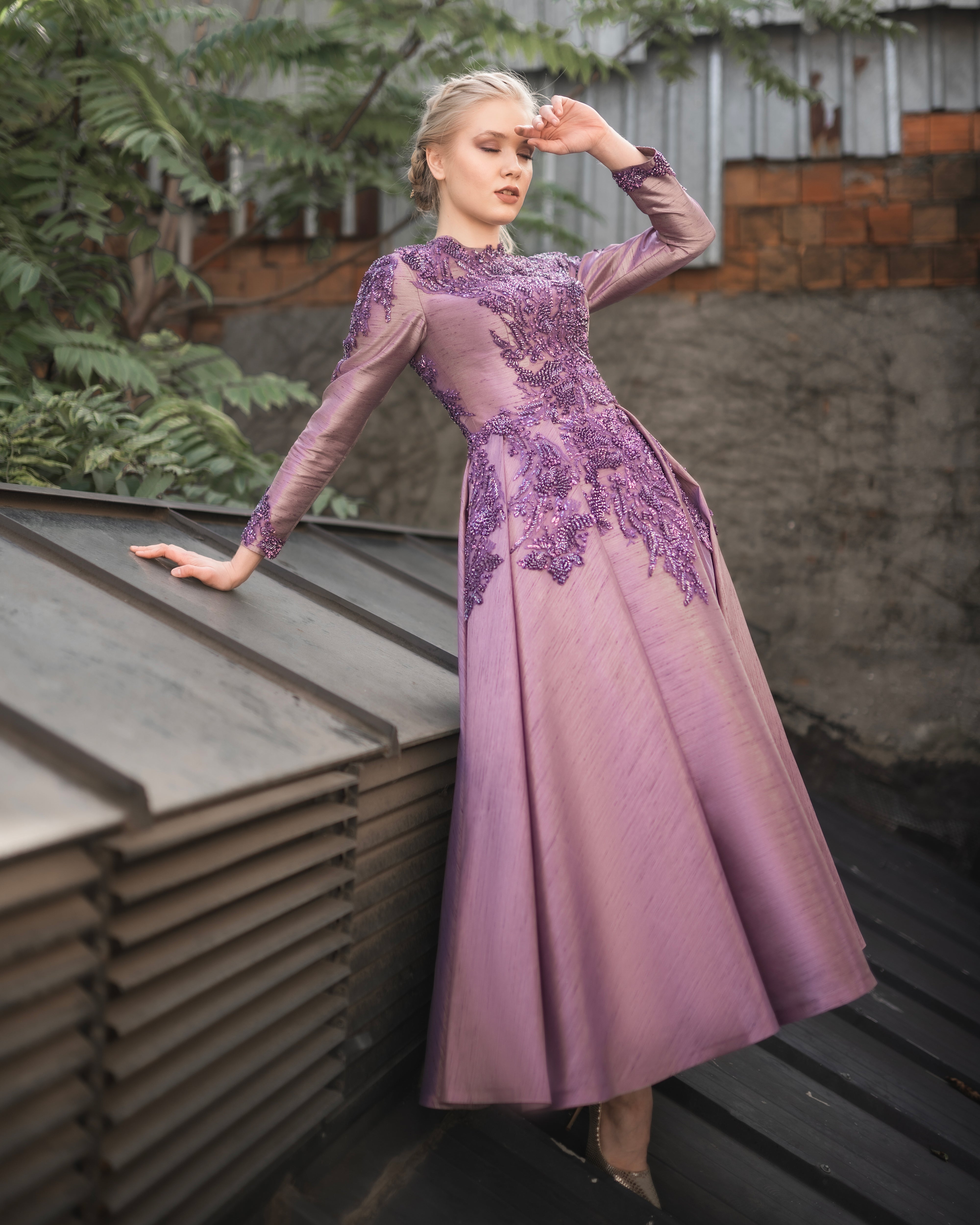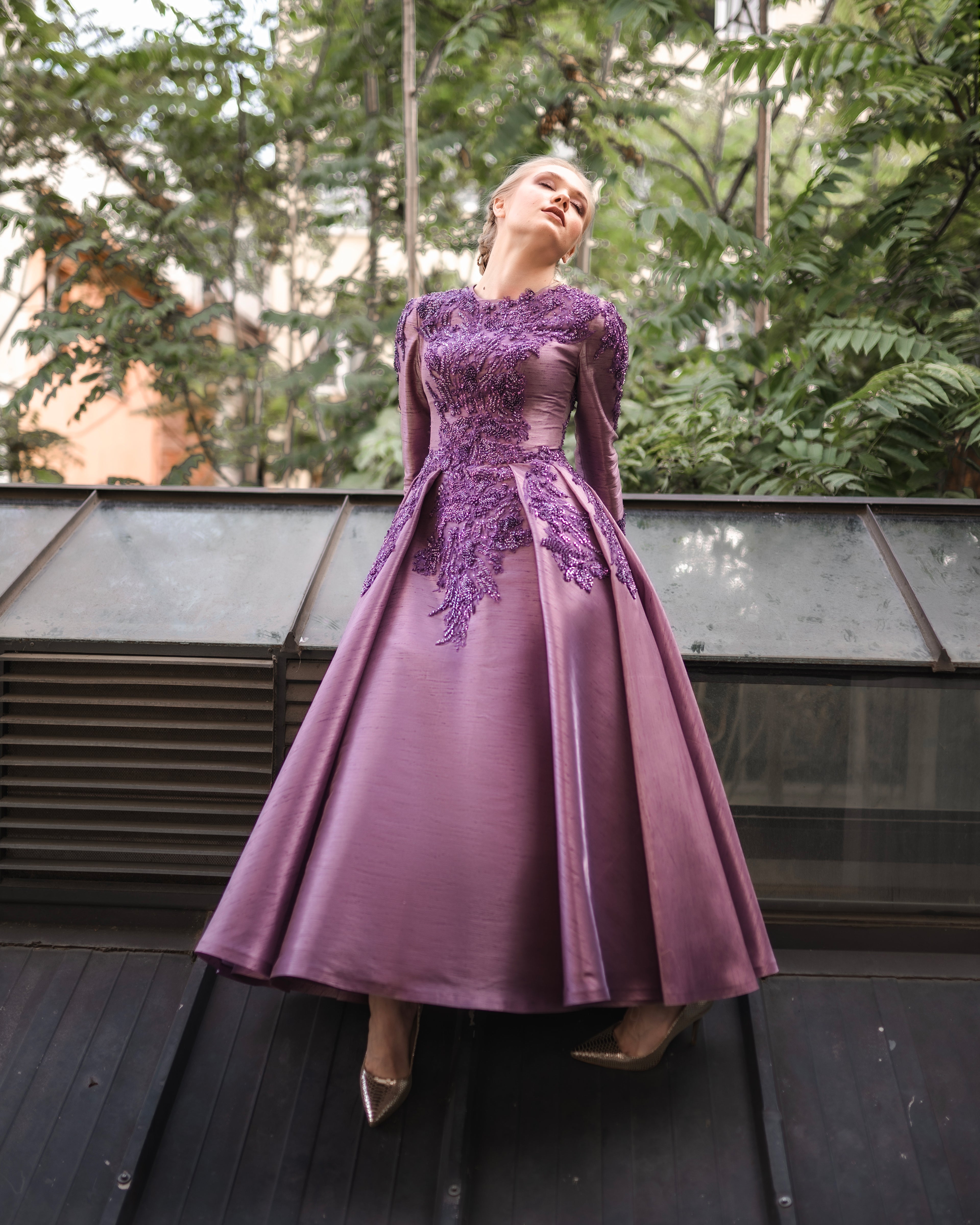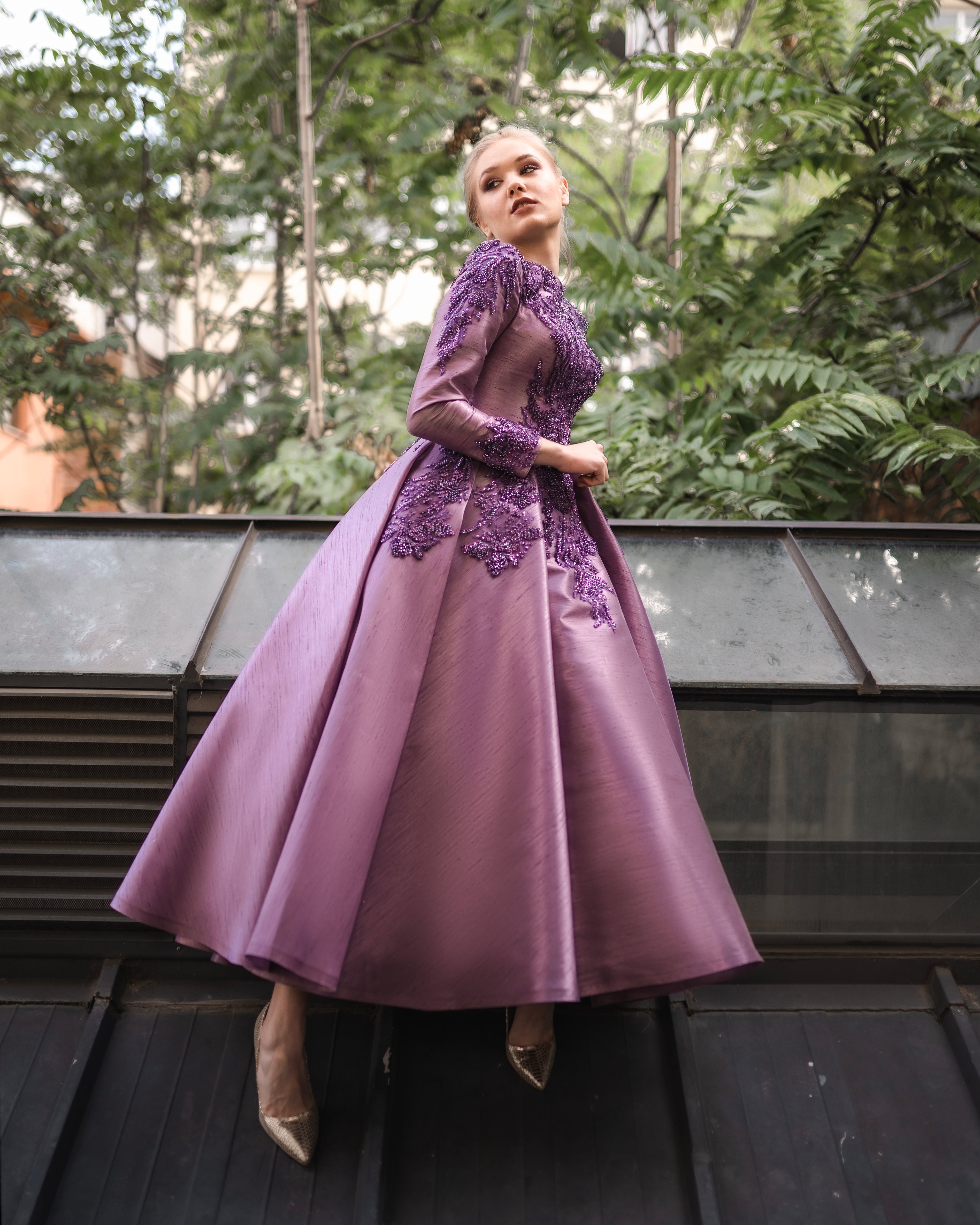 Derin mor tonunun sofistike etkisiyle öne çıkan bu özel abiye elbise, üst bölümde yer alan yoğun ve zarif işlemeleriyle güçlü bir duruş sergiler. Transparan kol ve üst detaylar tasarıma modern bir hafiflik katarken, yapılandırılmış etek formu asil ve dengeli bir siluet oluşturur. Işıltılı dokusu ve couture hissi veren işçiliği sayesinde davetler, özel organizasyonlar ve şık geceler için iddialı ama zarif bir seçenektir.