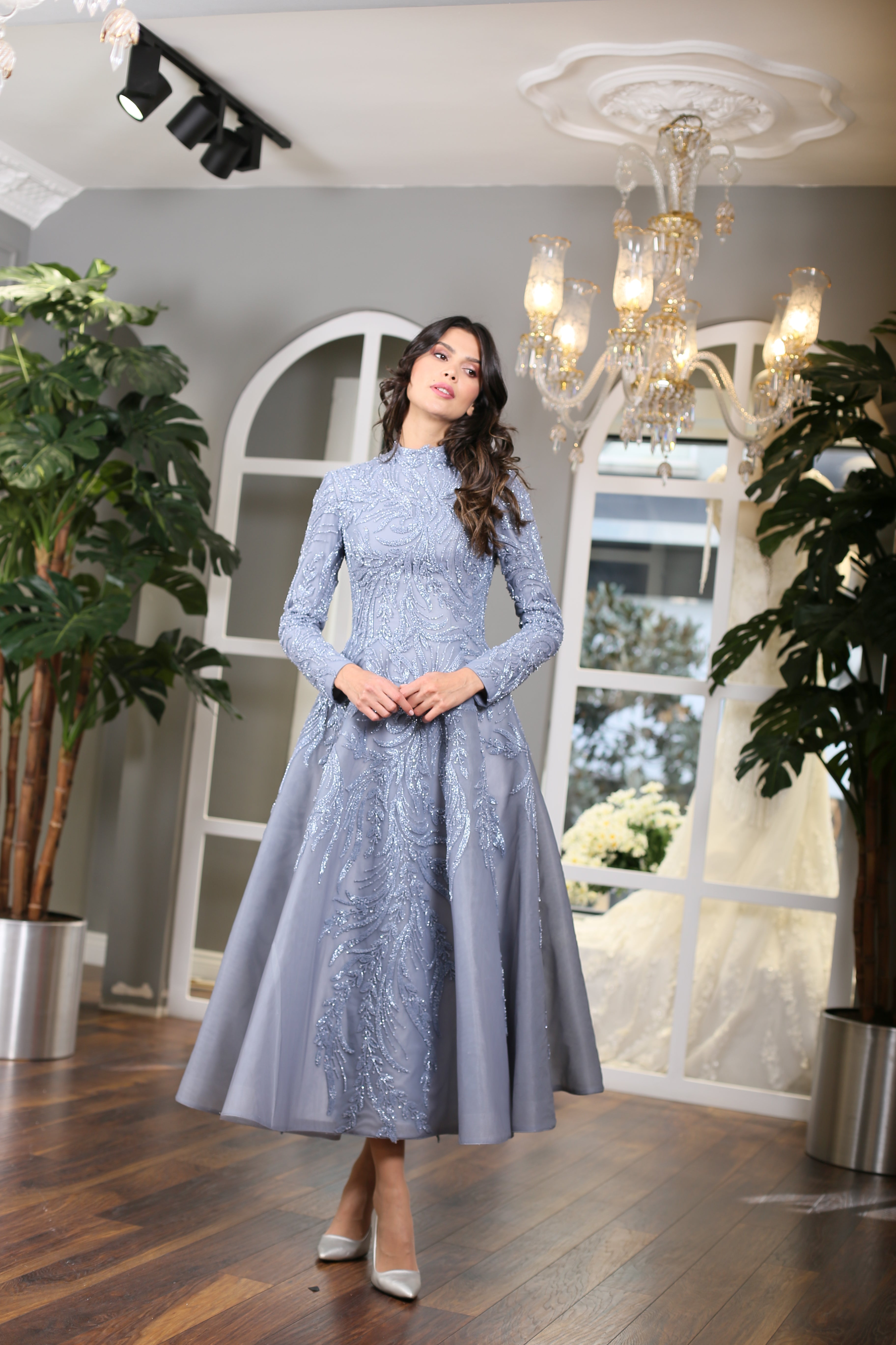 Modern çizgilerle yorumlanan bu özel tasarım abiye elbise, zarif işlemeleri ve dengeli silüetiyle şıklığı ön plana çıkarır. Midi boy etek formu, hareketli ve sofistike bir duruş sunarken; ince detaylarla işlenmiş kumaşı davet stiline zarif bir ışıltı katar. Uzun kollu yapısı ve akıcı kesimi sayesinde hem konforlu hem de elegan bir kullanım sağlar.